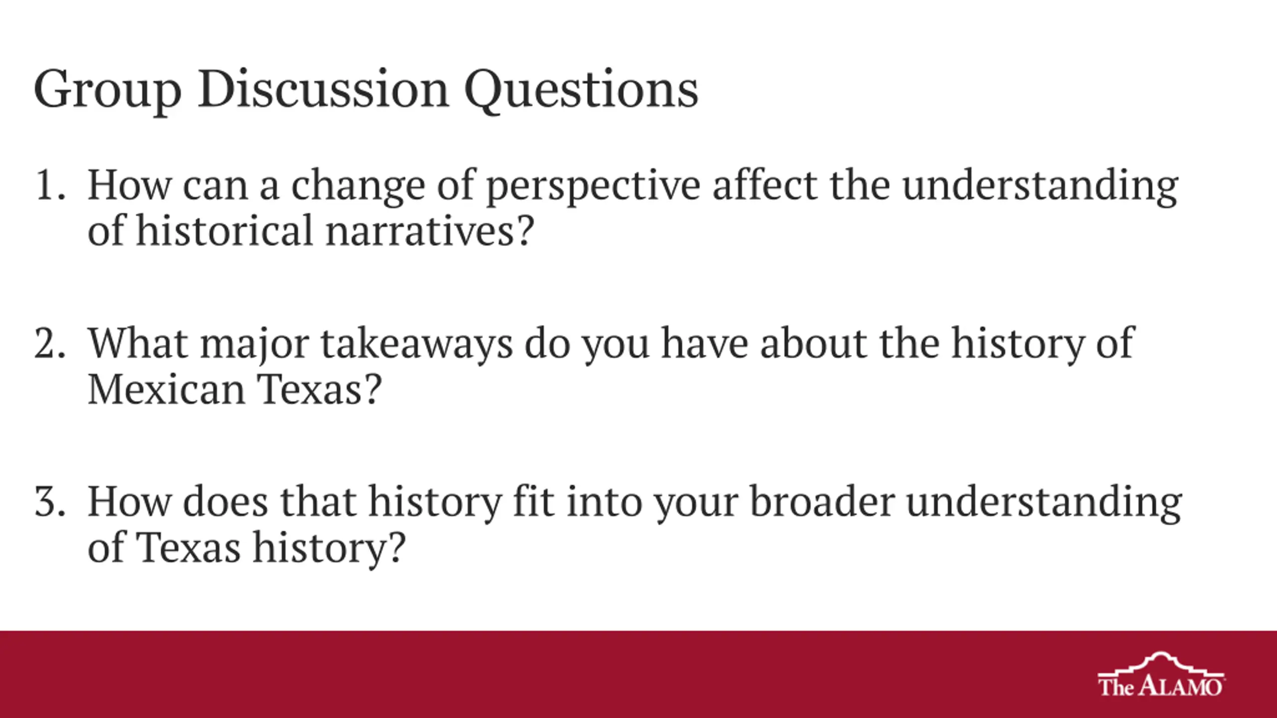 Group Discussion Questions 1. How can a change of perspective affect the understanding of historical narratives? 2. What major takeaways do you have about the history of Mexican Texas? 3. How does that history fit into your broader understanding of Texas history?