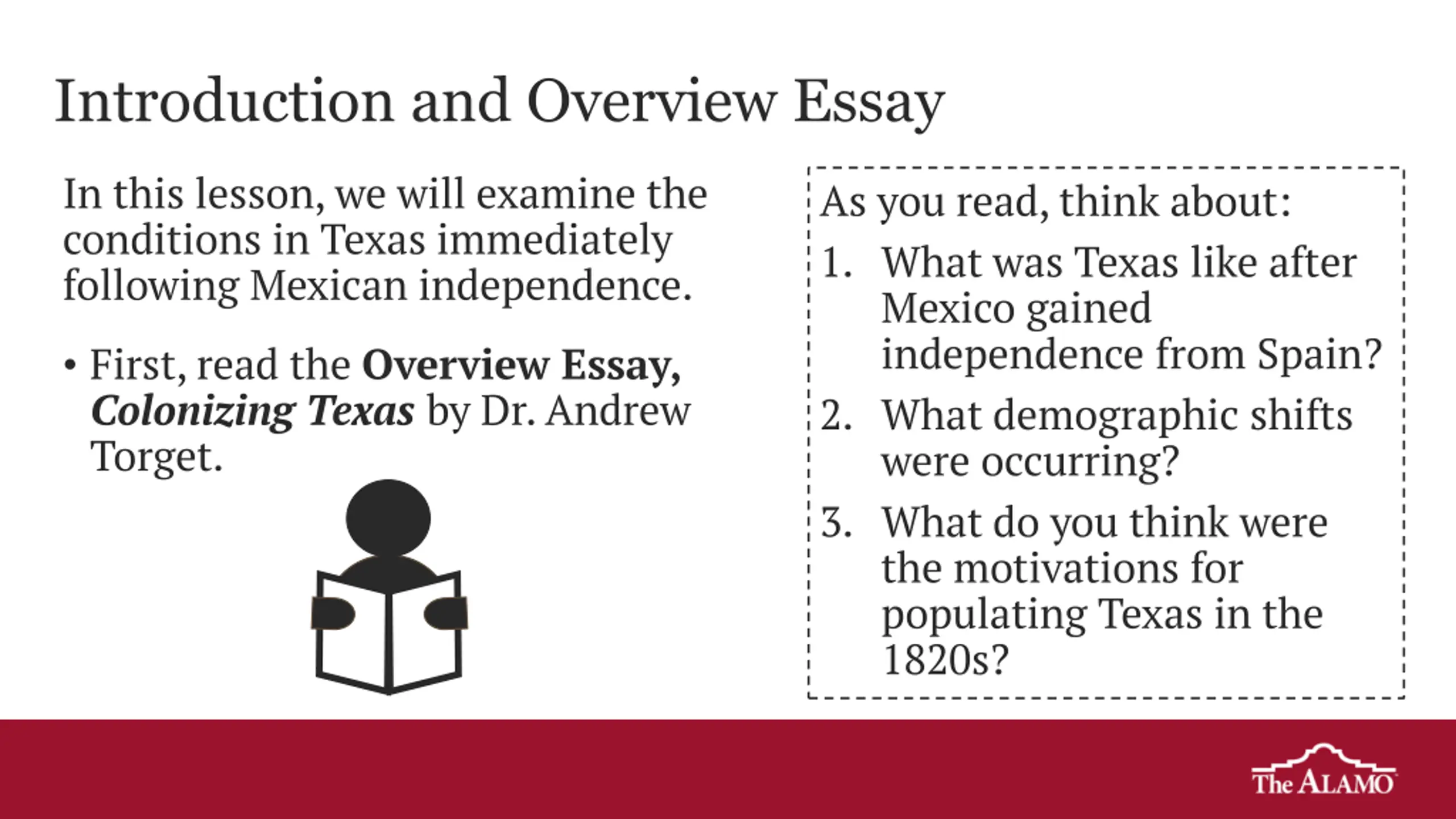 Introduction and Overview Essay In this lesson, we will examine the conditions in Texas immediately following Mexican independence. As you read, think about: 1. What was Texas like after Mexico gained independence from Spain? 2. What demographic shifts were occurring? 3. What do you think were the motivations for populating Texas in the 1820s? First, read the Overview Essay, Colonizing Texas by Dr. Andrew Torget.