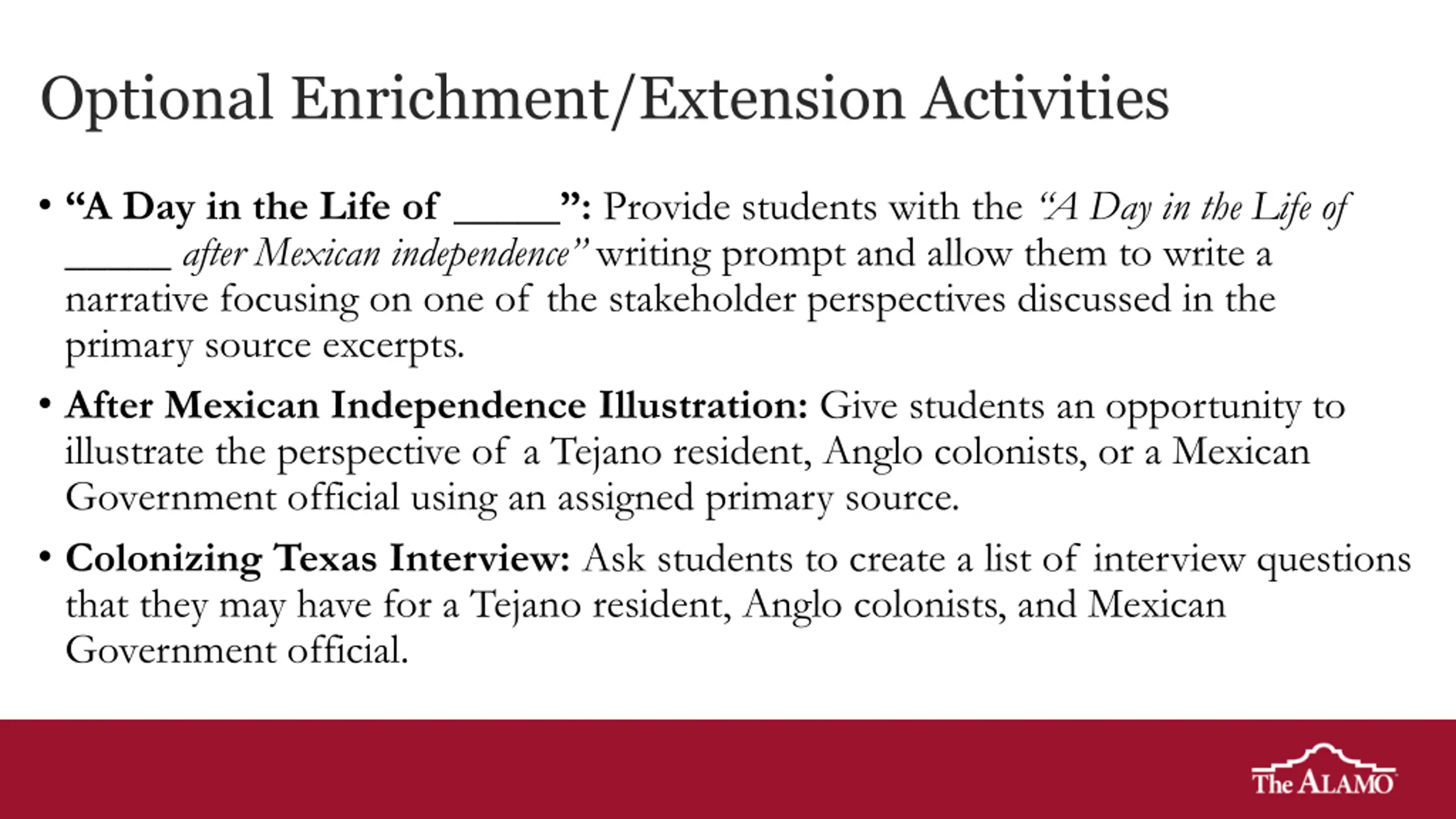 Optional Enrichment/Extension Activities A Day in the Life of _____ : Provide students with the A Day in the Life of _____ after Mexican independence writing prompt and allow them to write a narrative focusing on one of the stakeholder perspectives discussed in the primary source excerpts. After Mexican Independence Illustration: Give students an opportunity to illustrate the perspective of a Tejano resident, Anglo colonists, or a Mexican Government official using an assigned primary source. Colonizing Texas Interview: Ask students to create a list of interview questions that they may have for a Tejano resident, Anglo colonists, and Mexican Government official.