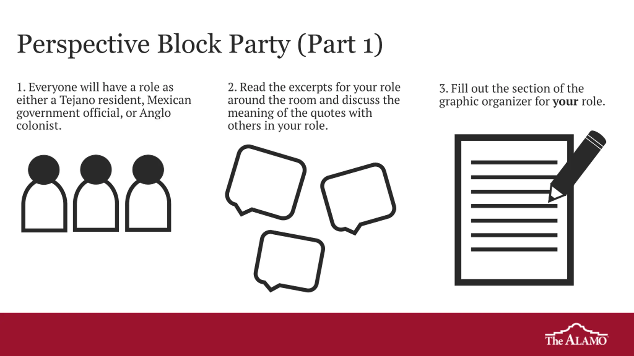 Perspective Block Party (Part 1) 1. Everyone will have a role as either a Tejano resident, Mexican government official, or Anglo colonist. 2. Read the excerpts for your role around the room and discuss the meaning of the quotes with others in your role. 3. Fill out the section of the graphic organizer for your role.