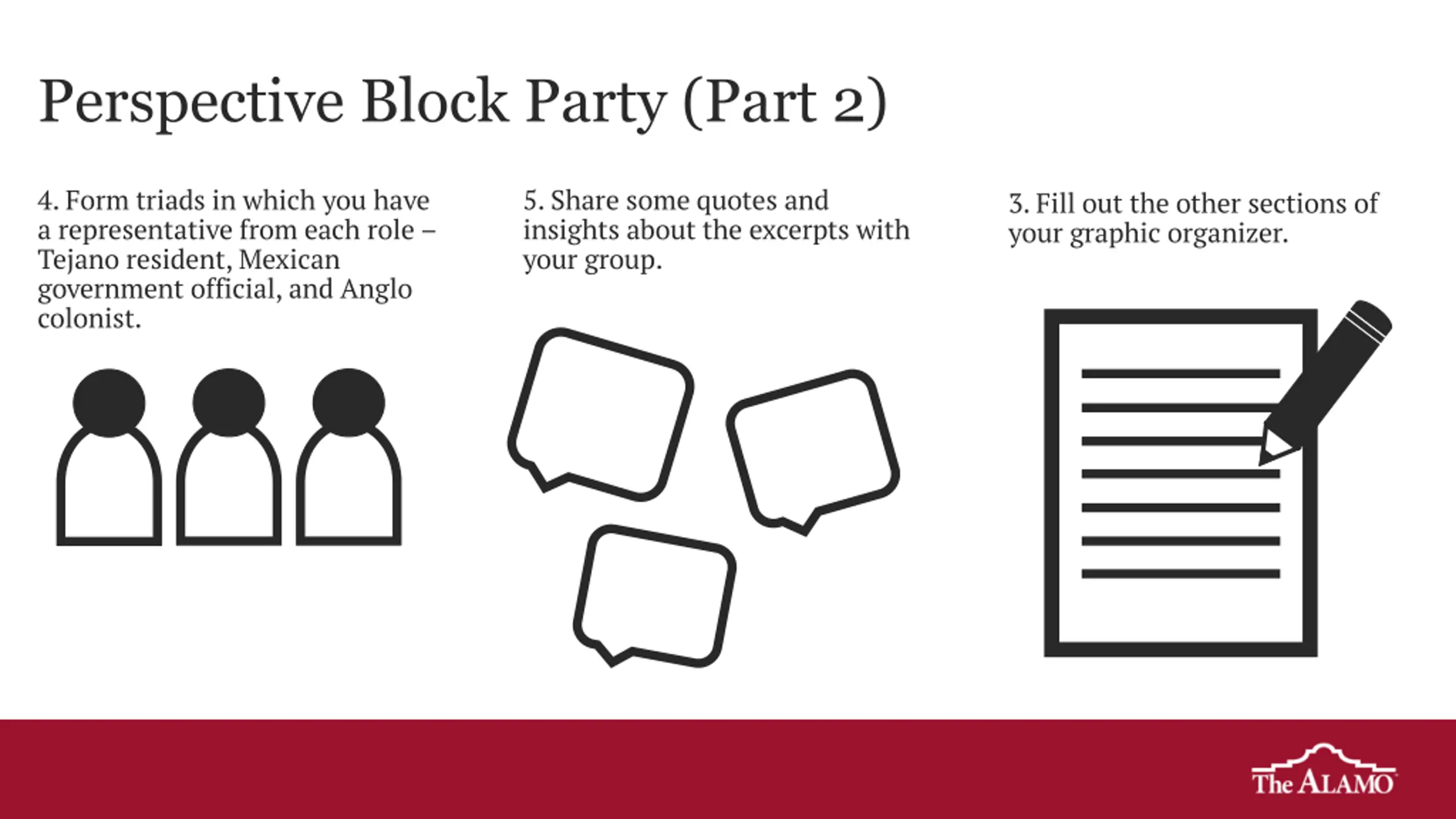 Perspective Block Party (Part 2) 4. Form triads in which you have a representative from each role Tejano resident, Mexican government official, and Anglo colonist. 5. Share some quotes and insights about the excerpts with your group. 3. Fill out the other sections of your graphic organizer.