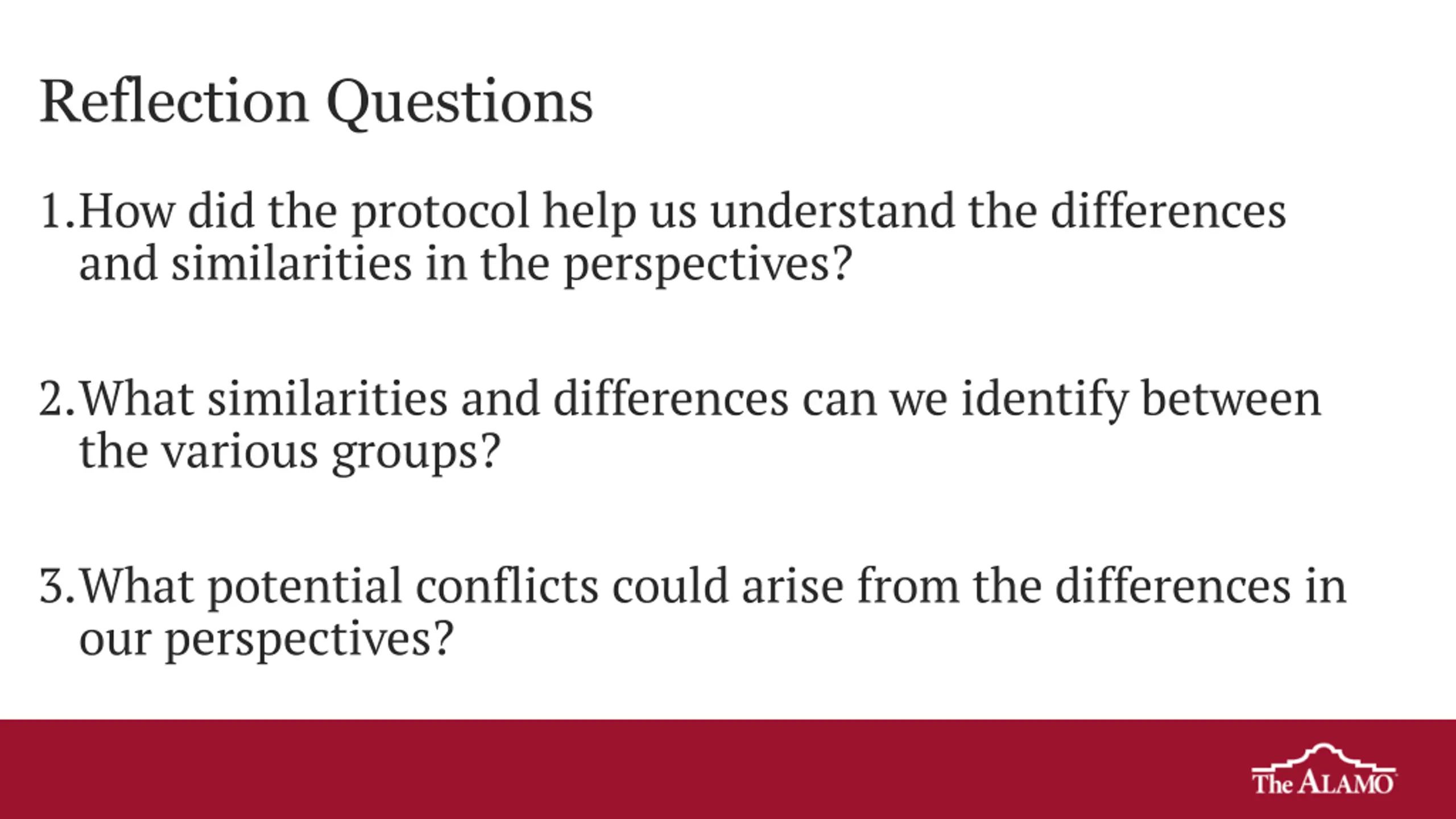 Reflection Questions 1.How did the protocol help us understand the differences and similarities in the perspectives? 2.What similarities and differences can we identify between the various groups? 3.What potential conflicts could arise from the differences in our perspectives?