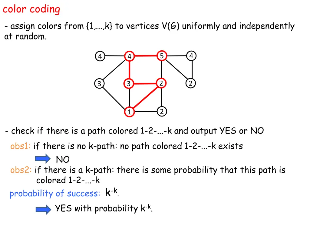 color coding - assign colors from {1,...,k} to vertices V(G) uniformly and independently at random. 5 4 4 4 2 2 3 3 2 1 - check if there is a path colored 1-2-...-k and output YES or NO obs1: if there is no k-path: no path colored 1-2-...-k exists NO obs2: if there is a k-path: there is some probability that this path is colored 1-2-...-k k-k. YES with probability k-k. probability of success: