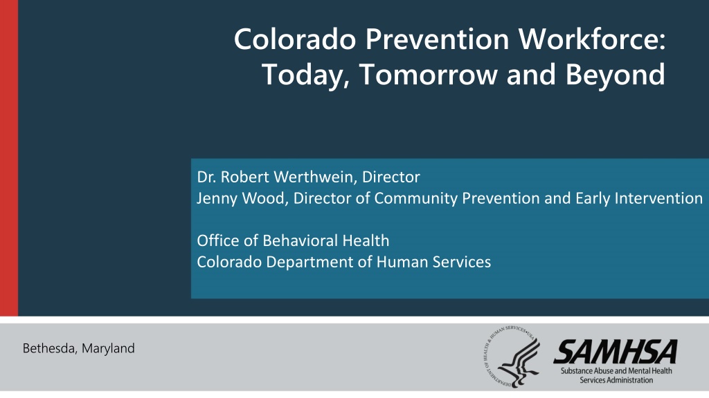 Colorado Prevention Workforce: Today, Tomorrow and Beyond Dr. Robert Werthwein, Director Jenny Wood, Director of Community Prevention and Early Intervention Office of Behavioral Health Colorado Department of Human Services Bethesda, Maryland