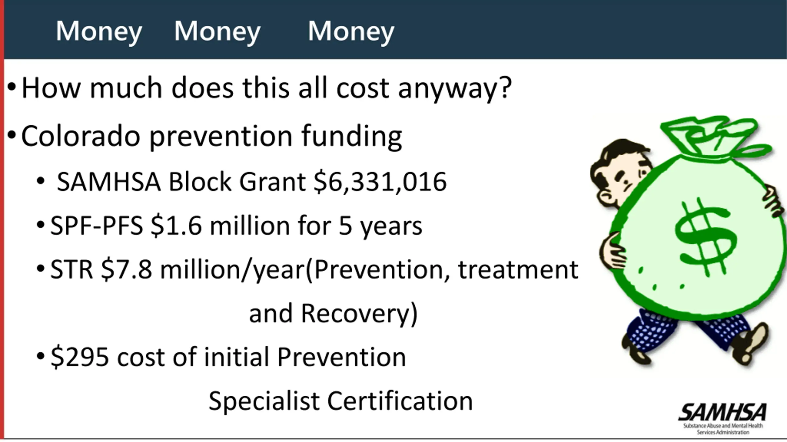 Money Money Money How much does this all cost anyway? Colorado prevention funding SAMHSA Block Grant $6,331,016 SPF-PFS $1.6 million for 5 years STR $7.8 million/year(Prevention, treatment and Recovery) $295 cost of initial Prevention Specialist Certification