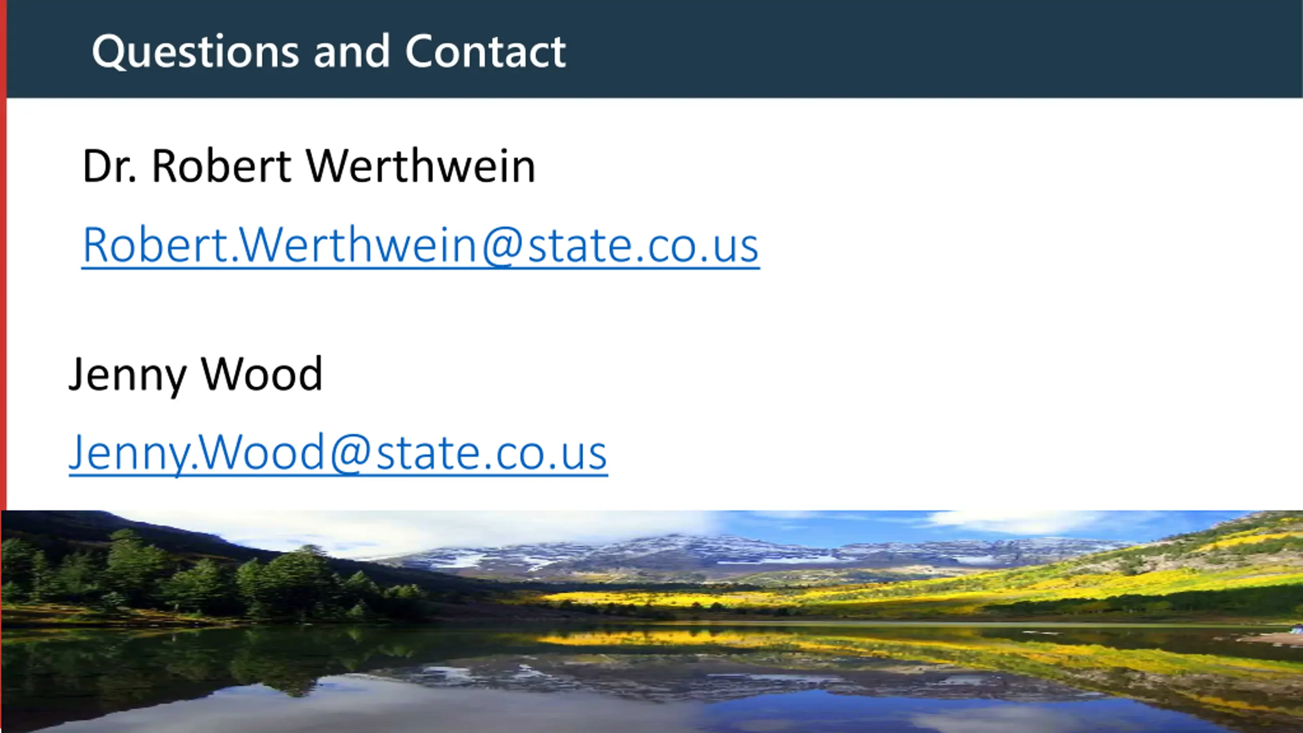 Questions and Contact Dr. Robert Werthwein Robert.Werthwein@state.co.us Jenny Wood Jenny.Wood@state.co.us