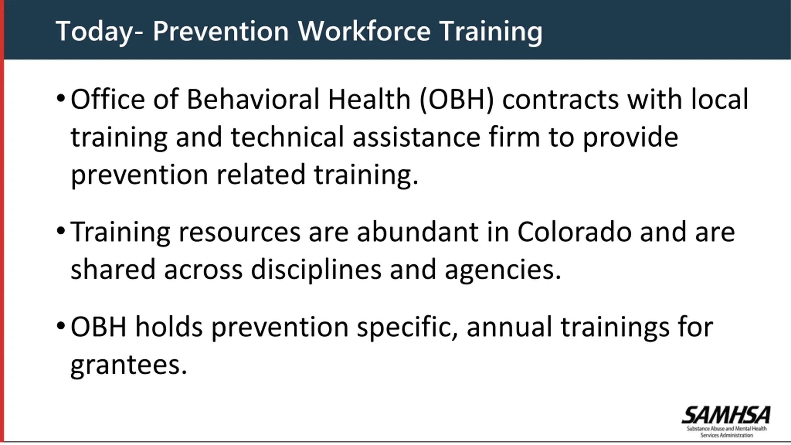 Today- Prevention Workforce Training Office of Behavioral Health (OBH) contracts with local training and technical assistance firm to provide prevention related training. Training resources are abundant in Colorado and are shared across disciplines and agencies. OBH holds prevention specific, annual trainings for grantees.