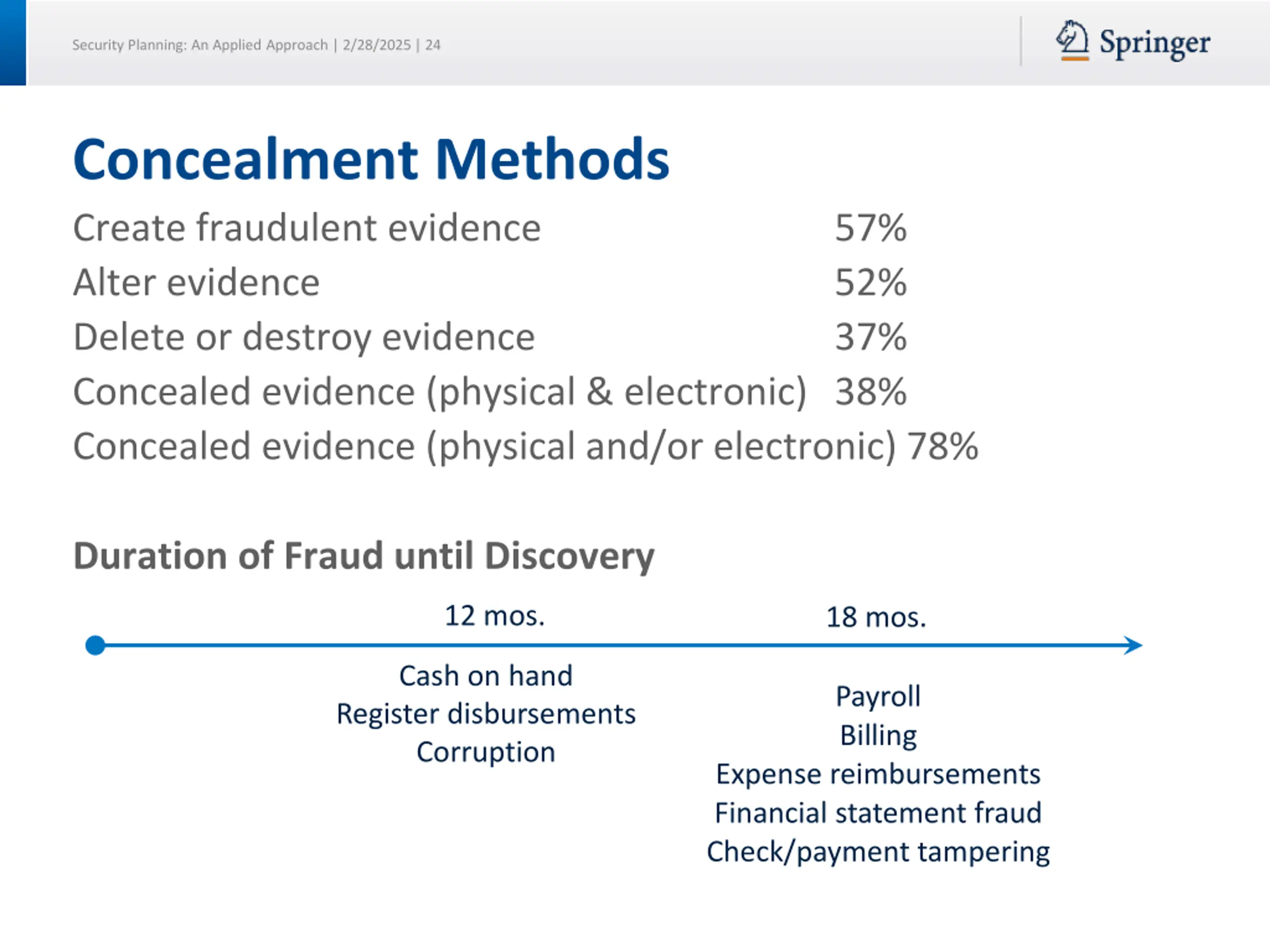 Security Planning: An Applied Approach | 2/28/2025 | 24 Concealment Methods Create fraudulent evidence Alter evidence Delete or destroy evidence Concealed evidence (physical & electronic) 38% Concealed evidence (physical and/or electronic) 78% 57% 52% 37% Duration of Fraud until Discovery 12 mos. 18 mos. Cash on hand Register disbursements Corruption Payroll Billing Expense reimbursements Financial statement fraud Check/payment tampering