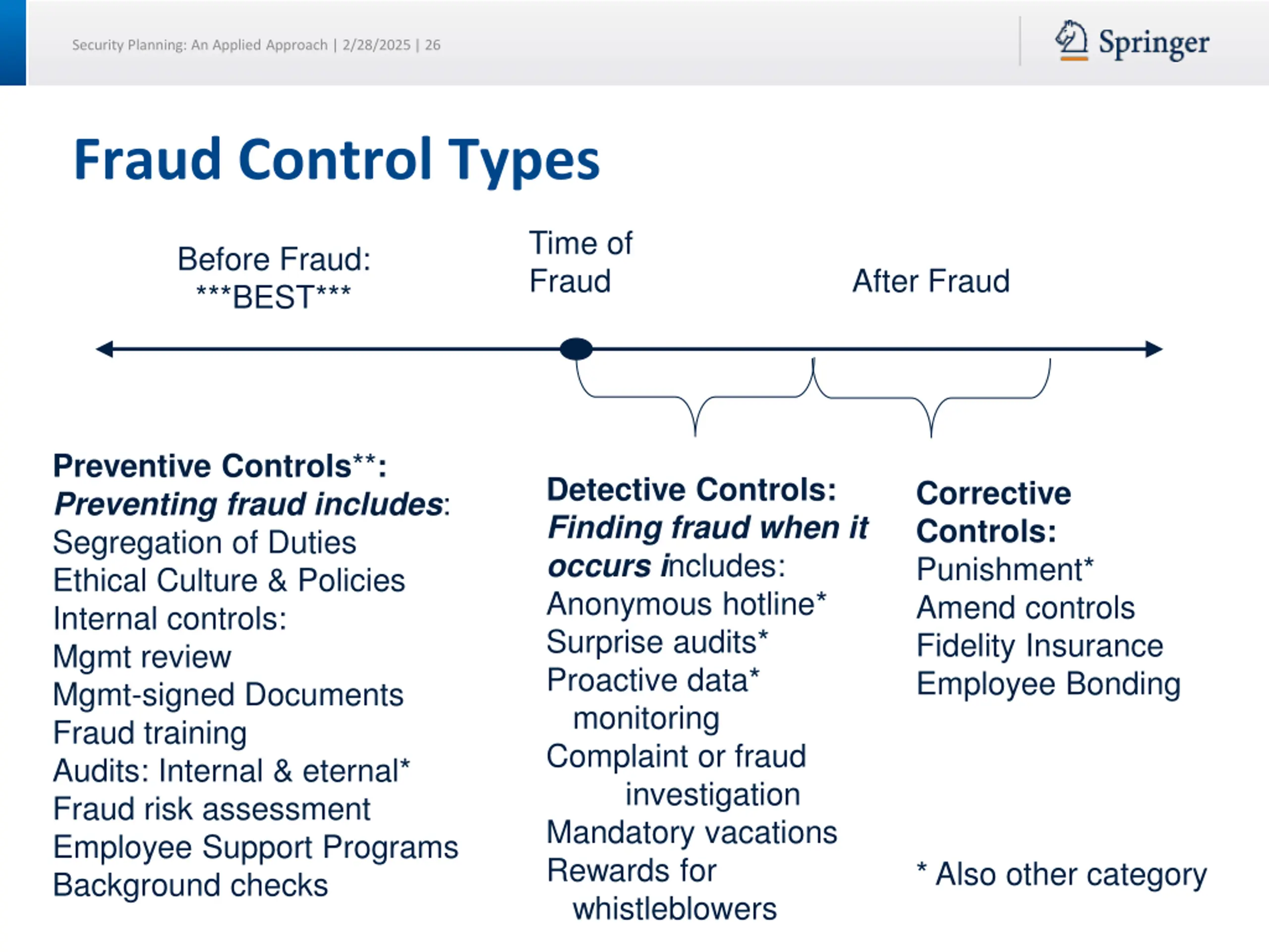 Security Planning: An Applied Approach | 2/28/2025 | 26 Fraud Control Types Time of Fraud Before Fraud: ***BEST*** After Fraud Preventive Controls**: Preventing fraud includes: Segregation of Duties Ethical Culture & Policies Internal controls: Mgmt review Mgmt-signed Documents Fraud training Audits: Internal & eternal* Fraud risk assessment Employee Support Programs Background checks Detective Controls: Finding fraud when it occurs includes: Anonymous hotline* Surprise audits* Proactive data* monitoring Complaint or fraud investigation Mandatory vacations Rewards for whistleblowers Corrective Controls: Punishment* Amend controls Fidelity Insurance Employee Bonding * Also other category