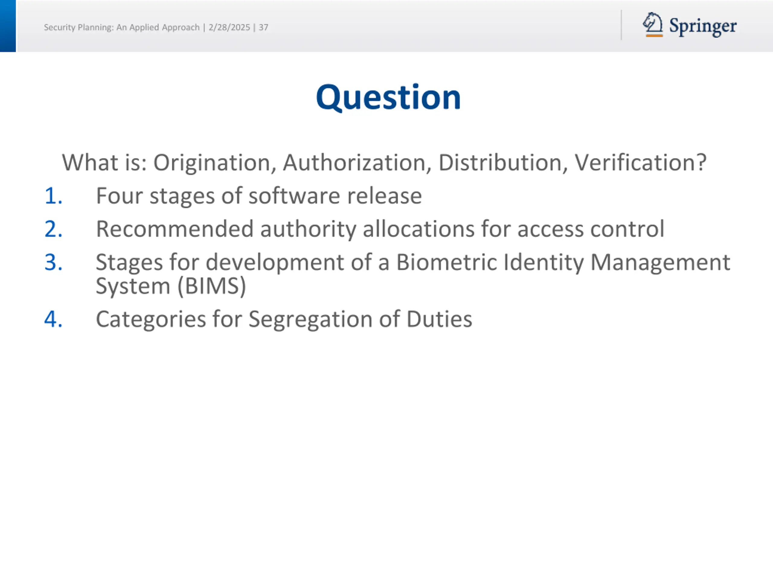 Security Planning: An Applied Approach | 2/28/2025 | 37 Question What is: Origination, Authorization, Distribution, Verification? 1. Four stages of software release 2. Recommended authority allocations for access control 3. Stages for development of a Biometric Identity Management System (BIMS) 4. Categories for Segregation of Duties