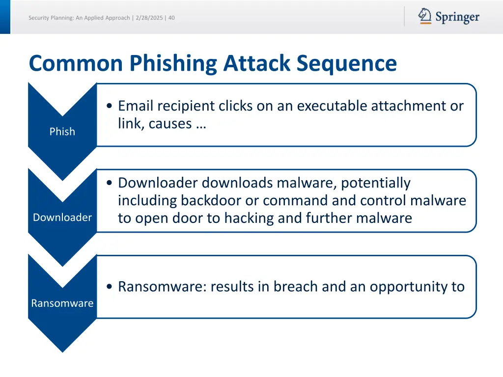 Security Planning: An Applied Approach | 2/28/2025 | 40 Common Phishing Attack Sequence Email recipient clicks on an executable attachment or link, causes Phish Downloader downloads malware, potentially including backdoor or command and control malware to open door to hacking and further malware Downloader Ransomware: results in breach and an opportunity to Ransomware