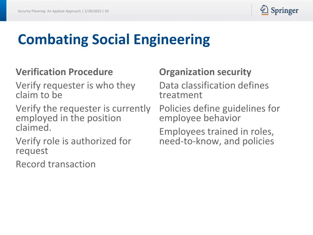 Security Planning: An Applied Approach | 2/28/2025 | 50 Combating Social Engineering Verification Procedure Verify requester is who they claim to be Verify the requester is currently employed in the position claimed. Verify role is authorized for request Record transaction Organization security Data classification defines treatment Policies define guidelines for employee behavior Employees trained in roles, need-to-know, and policies