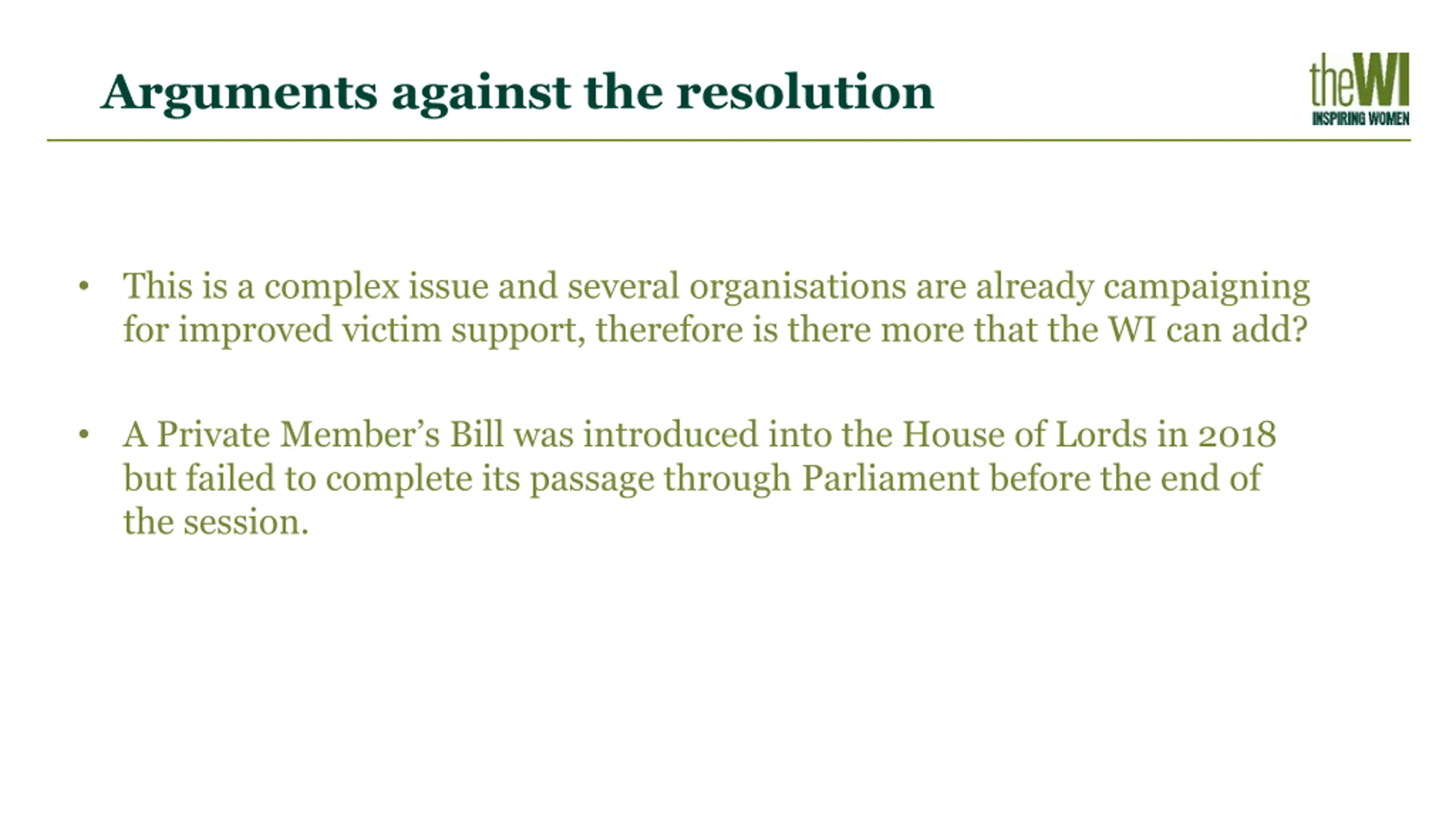 Arguments against the resolution This is a complex issue and several organisations are already campaigning for improved victim support, therefore is there more that the WI can add? A Private Member s Bill was introduced into the House of Lords in 2018 but failed to complete its passage through Parliament before the end of the session.