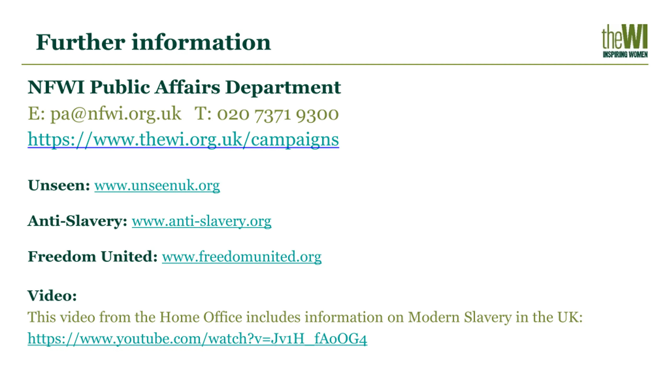 Further information NFWI Public Affairs Department E: pa@nfwi.org.uk T: 020 7371 9300 https://www.thewi.org.uk/campaigns Unseen: www.unseenuk.org Anti-Slavery: www.anti-slavery.org Freedom United: www.freedomunited.org Video: This video from the Home Office includes information on Modern Slavery in the UK: https://www.youtube.com/watch?v=Jv1H_fAoOG4