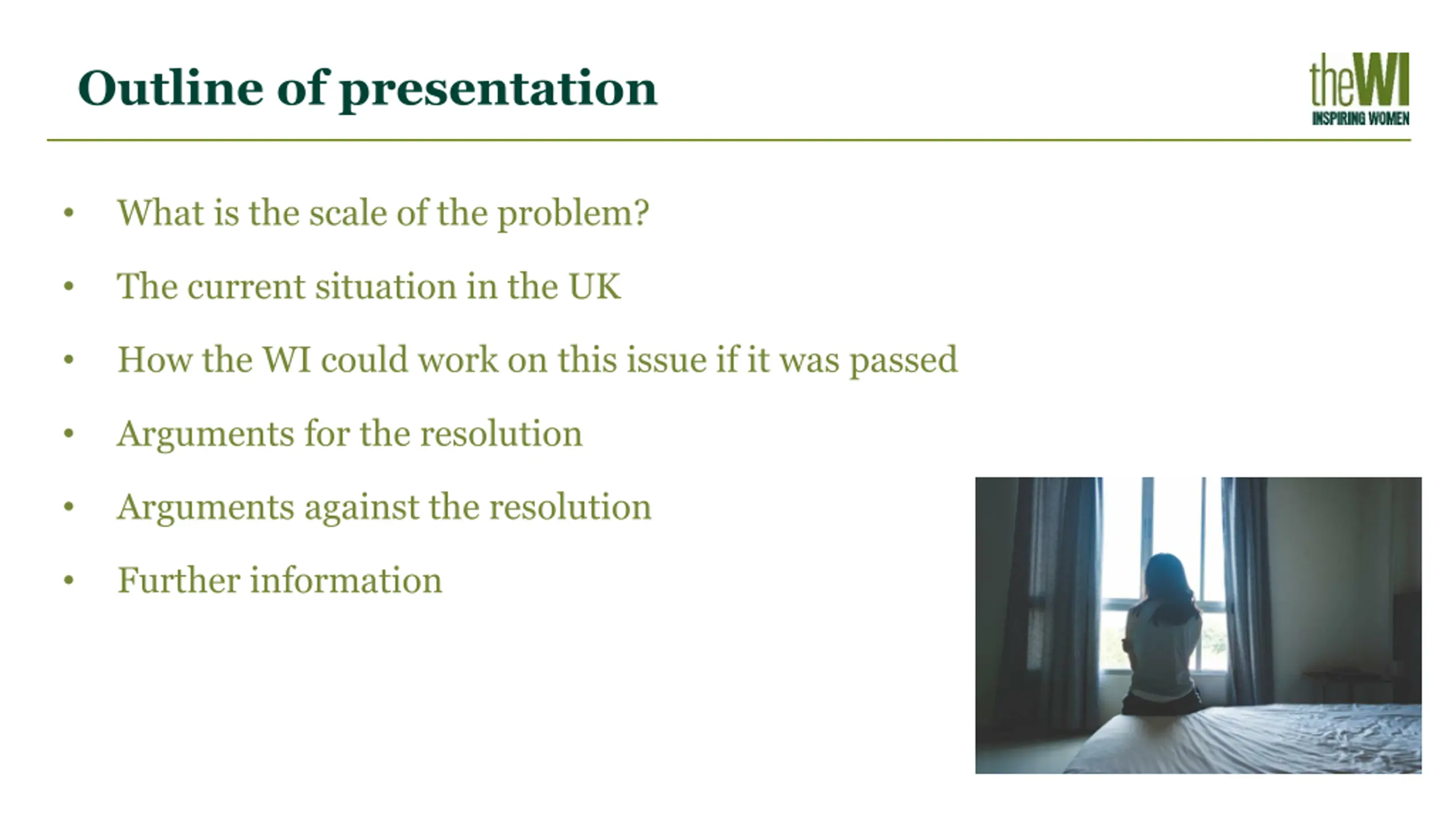 Outline of presentation What is the scale of the problem? The current situation in the UK How the WI could work on this issue if it was passed Arguments for the resolution Arguments against the resolution Further information