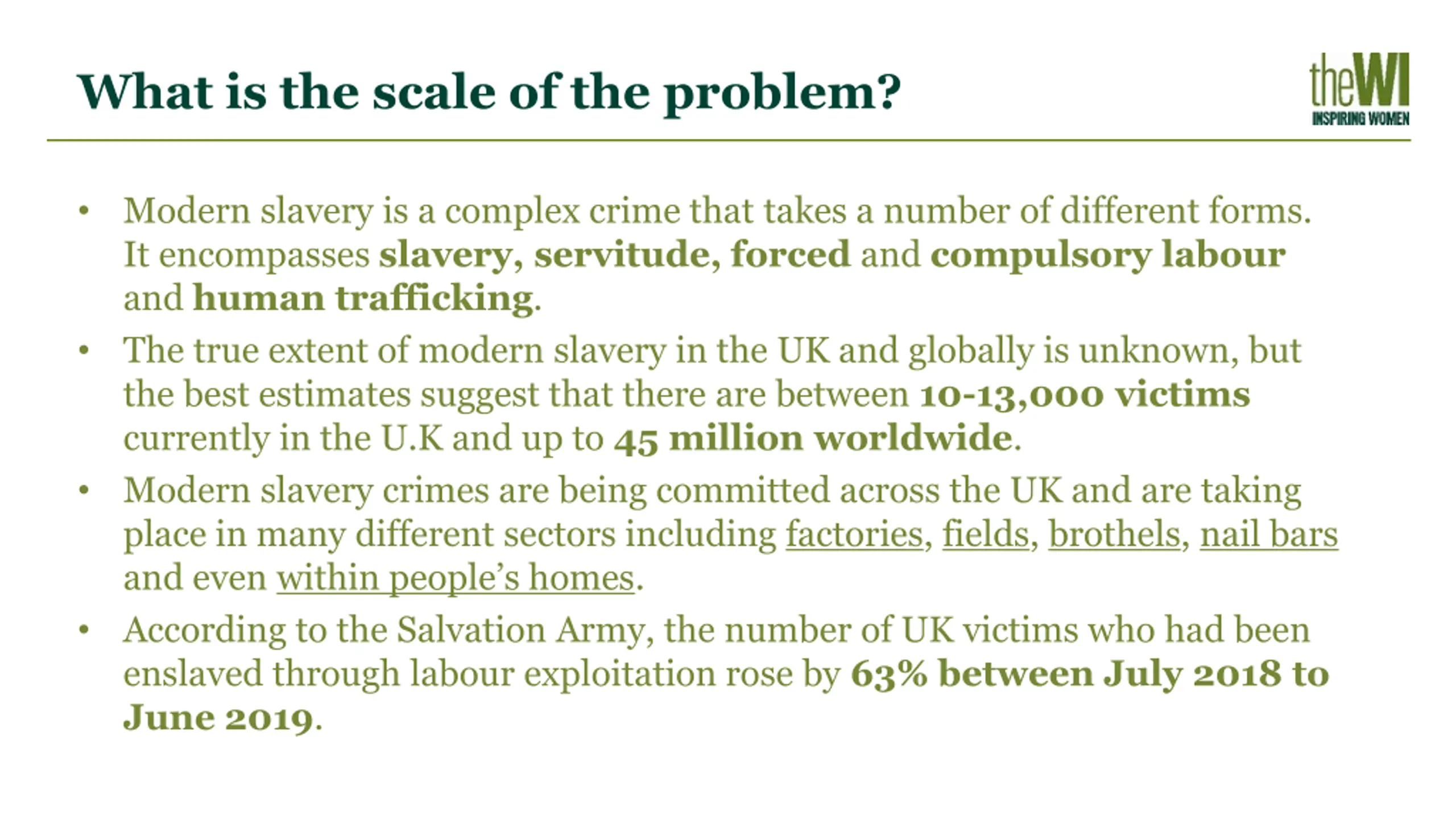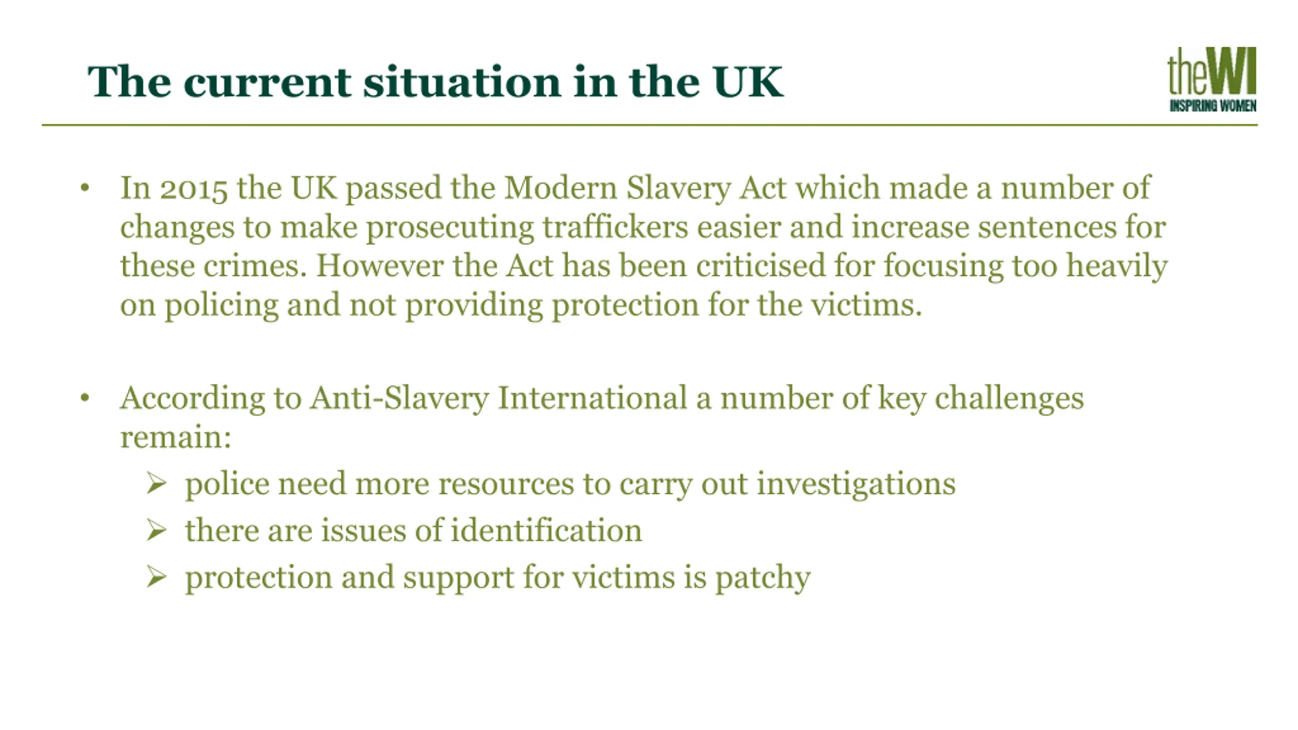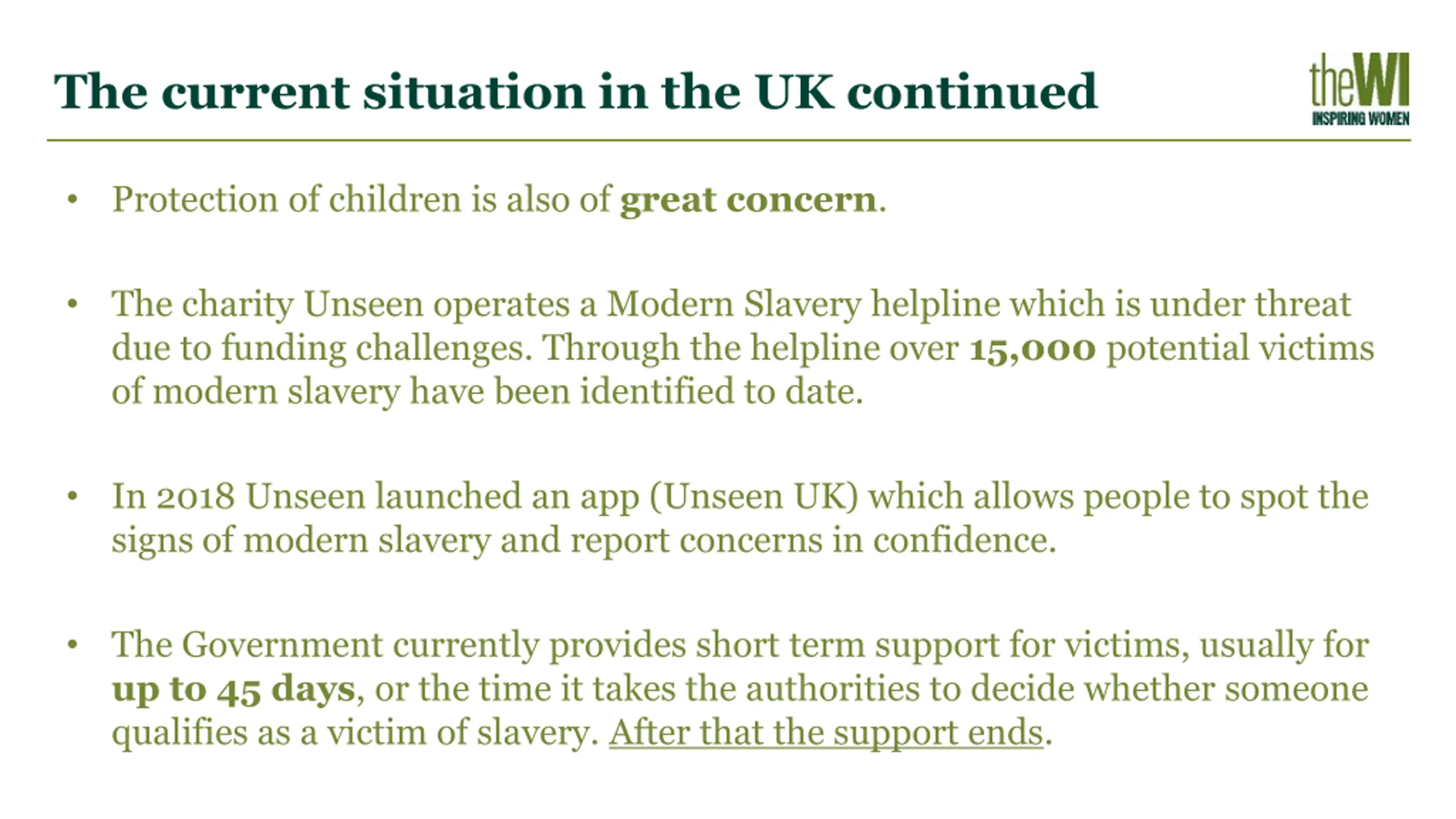 How the WI could work on this resolution At local and regional levels - members could raise awareness of the prevalence of modern slavery throughout society and promote the helpline and apps that currently exist. Nationally - the NFWI could work with organisations such as Anti-Slavery, Freedom United and Unseen to call on Government to introduce a Modern Slavery Victim Support Bill.