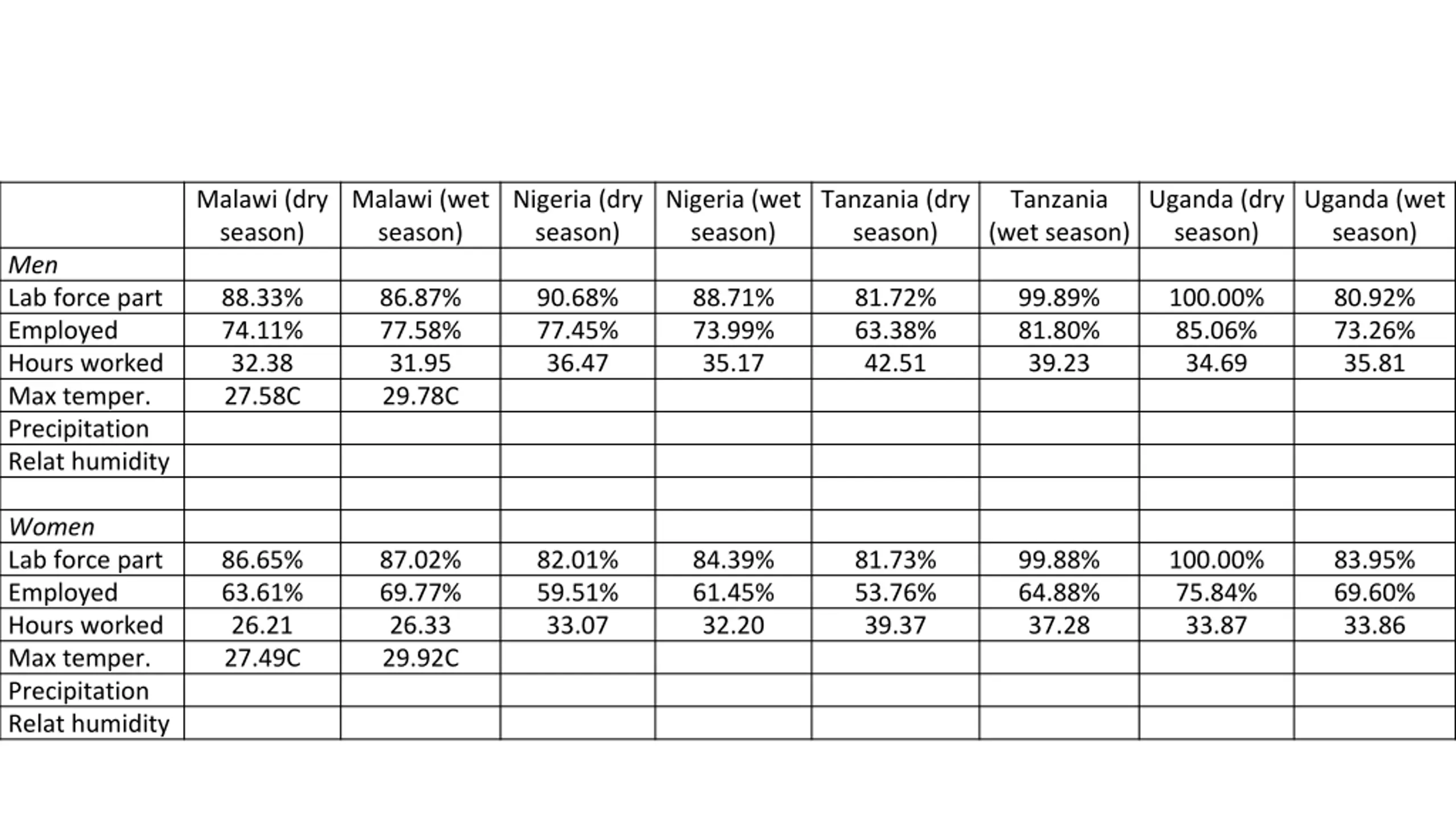 Malawi (dry season) Malawi (wet season) Nigeria (dry season) Nigeria (wet season) Tanzania (dry season) Tanzania (wet season) Uganda (dry season) Uganda (wet season) Men Lab force part Employed Hours worked Max temper. Precipitation Relat humidity 88.33% 74.11% 32.38 27.58C 86.87% 77.58% 31.95 29.78C 90.68% 77.45% 36.47 88.71% 73.99% 35.17 81.72% 63.38% 42.51 99.89% 81.80% 39.23 100.00% 85.06% 34.69 80.92% 73.26% 35.81 Women Lab force part Employed Hours worked Max temper. Precipitation Relat humidity 86.65% 63.61% 26.21 27.49C 87.02% 69.77% 26.33 29.92C 82.01% 59.51% 33.07 84.39% 61.45% 32.20 81.73% 53.76% 39.37 99.88% 64.88% 37.28 100.00% 75.84% 33.87 83.95% 69.60% 33.86