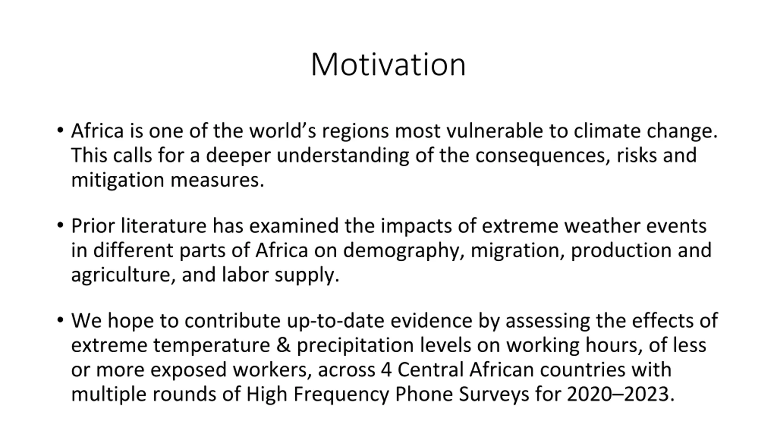 Motivation Africa is one of the world s regions most vulnerable to climate change. This calls for a deeper understanding of the consequences, risks and mitigation measures. Prior literature has examined the impacts of extreme weather events in different parts of Africa on demography, migration, production and agriculture, and labor supply. We hope to contribute up-to-date evidence by assessing the effects of extreme temperature & precipitation levels on working hours, of less or more exposed workers, across 4 Central African countries with multiple rounds of High Frequency Phone Surveys for 2020 2023.