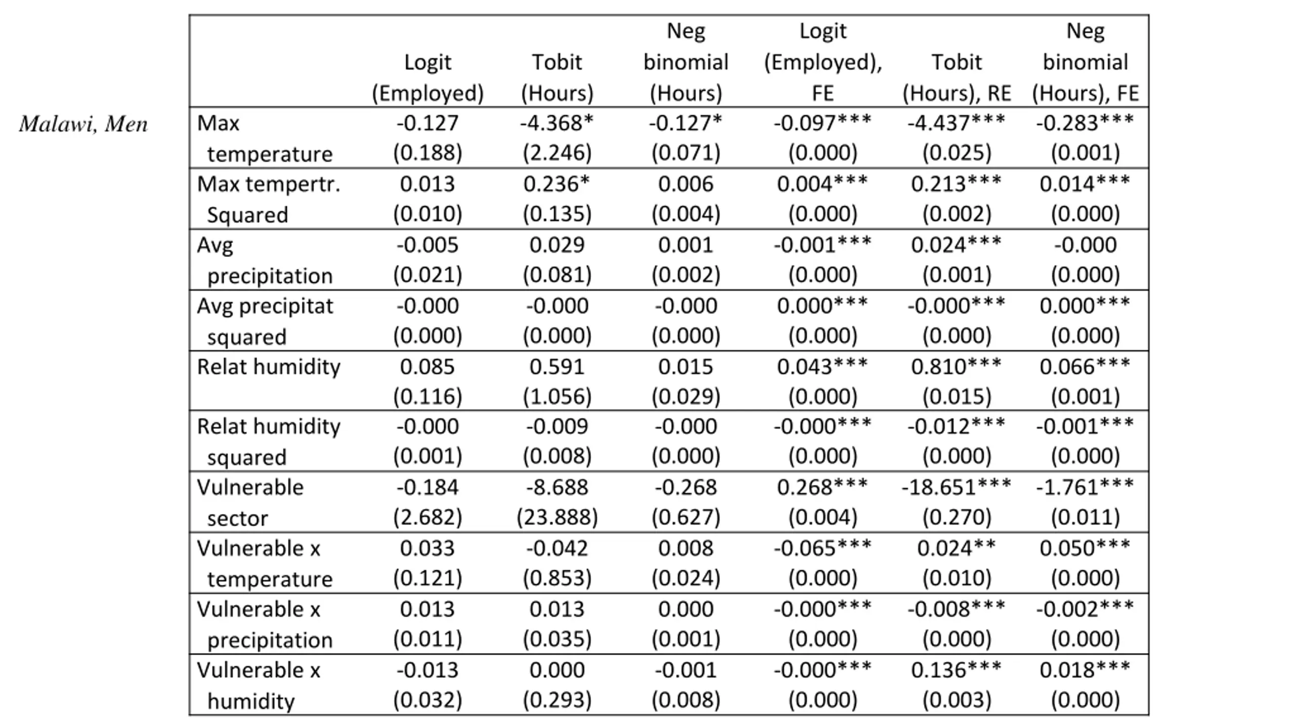 Neg Logit Neg Logit Tobit (Hours) -4.368* (2.246) 0.236* (0.135) 0.029 (0.081) -0.000 (0.000) 0.591 (1.056) -0.009 (0.008) -8.688 (23.888) -0.042 (0.853) 0.013 (0.035) 0.000 (0.293) Tobit binomial (Hours) -0.127* (0.071) 0.006 (0.004) 0.001 (0.002) -0.000 (0.000) 0.015 (0.029) -0.000 (0.000) -0.268 (0.627) 0.008 (0.024) 0.000 (0.001) -0.001 (0.008) (Employed), FE -0.097*** (0.000) 0.004*** (0.000) -0.001*** (0.000) 0.000*** (0.000) 0.043*** (0.000) -0.000*** (0.000) 0.268*** (0.004) -0.065*** (0.000) -0.000*** (0.000) -0.000*** (0.000) binomial (Hours), FE -0.283*** (0.001) 0.014*** (0.000) -0.000 (0.000) 0.000*** (0.000) 0.066*** (0.001) -0.001*** (0.000) -1.761*** (0.011) 0.050*** (0.000) -0.002*** (0.000) 0.018*** (0.000) (Employed) -0.127 (0.188) 0.013 (0.010) -0.005 (0.021) -0.000 (0.000) 0.085 (0.116) -0.000 (0.001) -0.184 (2.682) 0.033 (0.121) 0.013 (0.011) -0.013 (0.032) (Hours), RE -4.437*** (0.025) 0.213*** (0.002) 0.024*** (0.001) -0.000*** (0.000) 0.810*** (0.015) -0.012*** (0.000) -18.651*** (0.270) 0.024** (0.010) -0.008*** (0.000) 0.136*** (0.003) Malawi, Men Max temperature Max tempertr. Squared Avg precipitation Avg precipitat squared Relat humidity Relat humidity squared Vulnerable sector Vulnerable x temperature Vulnerable x precipitation Vulnerable x humidity