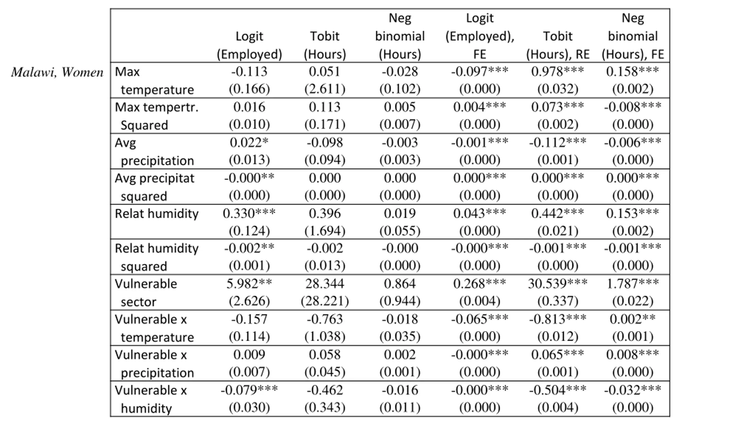 Neg Logit Neg Logit Tobit (Hours) 0.051 (2.611) 0.113 (0.171) -0.098 (0.094) 0.000 (0.000) 0.396 (1.694) -0.002 (0.013) 28.344 (28.221) -0.763 (1.038) 0.058 (0.045) -0.462 (0.343) Tobit binomial (Hours) -0.028 (0.102) 0.005 (0.007) -0.003 (0.003) 0.000 (0.000) 0.019 (0.055) -0.000 (0.000) 0.864 (0.944) -0.018 (0.035) 0.002 (0.001) -0.016 (0.011) (Employed), FE -0.097*** (0.000) 0.004*** (0.000) -0.001*** (0.000) 0.000*** (0.000) 0.043*** (0.000) -0.000*** (0.000) 0.268*** (0.004) -0.065*** (0.000) -0.000*** (0.000) -0.000*** (0.000) binomial (Hours), FE 0.158*** (0.002) -0.008*** (0.000) -0.006*** (0.000) 0.000*** (0.000) 0.153*** (0.002) -0.001*** (0.000) 1.787*** (0.022) 0.002** (0.001) 0.008*** (0.000) -0.032*** (0.000) (Employed) -0.113 (0.166) 0.016 (0.010) 0.022* (0.013) -0.000** (0.000) 0.330*** (0.124) -0.002** (0.001) 5.982** (2.626) -0.157 (0.114) 0.009 (0.007) -0.079*** (0.030) (Hours), RE 0.978*** (0.032) 0.073*** (0.002) -0.112*** (0.001) 0.000*** (0.000) 0.442*** (0.021) -0.001*** (0.000) 30.539*** (0.337) -0.813*** (0.012) 0.065*** (0.001) -0.504*** (0.004) Malawi, Women Max temperature Max tempertr. Squared Avg precipitation Avg precipitat squared Relat humidity Relat humidity squared Vulnerable sector Vulnerable x temperature Vulnerable x precipitation Vulnerable x humidity