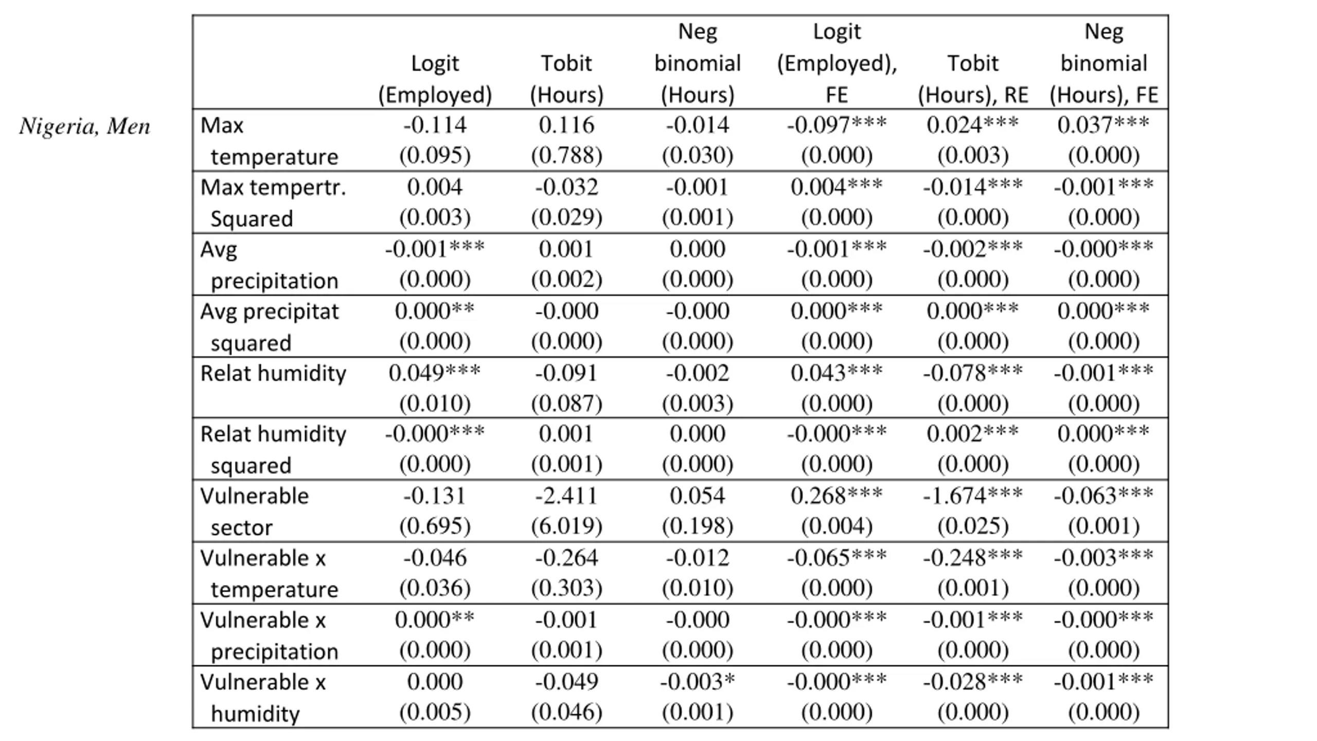 Neg Logit Neg Logit Tobit (Hours) 0.116 (0.788) -0.032 (0.029) 0.001 (0.002) -0.000 (0.000) -0.091 (0.087) 0.001 (0.001) -2.411 (6.019) -0.264 (0.303) -0.001 (0.001) -0.049 (0.046) Tobit binomial (Hours) -0.014 (0.030) -0.001 (0.001) 0.000 (0.000) -0.000 (0.000) -0.002 (0.003) 0.000 (0.000) 0.054 (0.198) -0.012 (0.010) -0.000 (0.000) -0.003* (0.001) (Employed), FE -0.097*** (0.000) 0.004*** (0.000) -0.001*** (0.000) 0.000*** (0.000) 0.043*** (0.000) -0.000*** (0.000) 0.268*** (0.004) -0.065*** (0.000) -0.000*** (0.000) -0.000*** (0.000) binomial (Hours), FE 0.037*** (0.000) -0.001*** (0.000) -0.000*** (0.000) 0.000*** (0.000) -0.001*** (0.000) 0.000*** (0.000) -0.063*** (0.001) -0.003*** (0.000) -0.000*** (0.000) -0.001*** (0.000) (Employed) -0.114 (0.095) 0.004 (0.003) -0.001*** (0.000) 0.000** (0.000) 0.049*** (0.010) -0.000*** (0.000) -0.131 (0.695) -0.046 (0.036) 0.000** (0.000) 0.000 (0.005) (Hours), RE 0.024*** (0.003) -0.014*** (0.000) -0.002*** (0.000) 0.000*** (0.000) -0.078*** (0.000) 0.002*** (0.000) -1.674*** (0.025) -0.248*** (0.001) -0.001*** (0.000) -0.028*** (0.000) Nigeria, Men Max temperature Max tempertr. Squared Avg precipitation Avg precipitat squared Relat humidity Relat humidity squared Vulnerable sector Vulnerable x temperature Vulnerable x precipitation Vulnerable x humidity