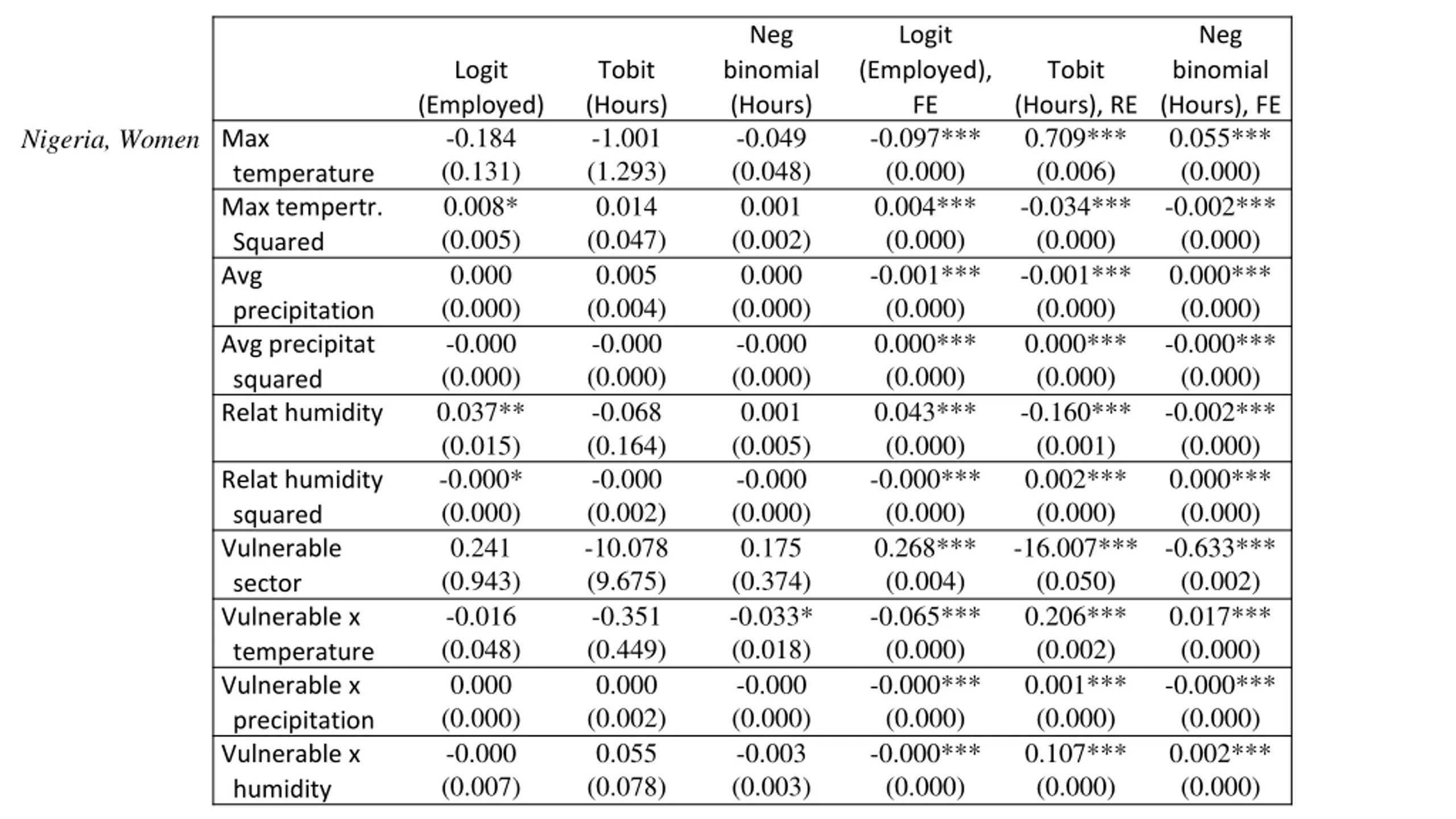 Neg Logit Neg Logit Tobit (Hours) -1.001 (1.293) 0.014 (0.047) 0.005 (0.004) -0.000 (0.000) -0.068 (0.164) -0.000 (0.002) -10.078 (9.675) -0.351 (0.449) 0.000 (0.002) 0.055 (0.078) Tobit binomial (Hours) -0.049 (0.048) 0.001 (0.002) 0.000 (0.000) -0.000 (0.000) 0.001 (0.005) -0.000 (0.000) 0.175 (0.374) -0.033* (0.018) -0.000 (0.000) -0.003 (0.003) (Employed), FE -0.097*** (0.000) 0.004*** (0.000) -0.001*** (0.000) 0.000*** (0.000) 0.043*** (0.000) -0.000*** (0.000) 0.268*** (0.004) -0.065*** (0.000) -0.000*** (0.000) -0.000*** (0.000) binomial (Hours), FE 0.055*** (0.000) -0.002*** (0.000) 0.000*** (0.000) -0.000*** (0.000) -0.002*** (0.000) 0.000*** (0.000) -0.633*** (0.002) 0.017*** (0.000) -0.000*** (0.000) 0.002*** (0.000) (Employed) -0.184 (0.131) 0.008* (0.005) 0.000 (0.000) -0.000 (0.000) 0.037** (0.015) -0.000* (0.000) 0.241 (0.943) -0.016 (0.048) 0.000 (0.000) -0.000 (0.007) (Hours), RE 0.709*** (0.006) -0.034*** (0.000) -0.001*** (0.000) 0.000*** (0.000) -0.160*** (0.001) 0.002*** (0.000) -16.007*** (0.050) 0.206*** (0.002) 0.001*** (0.000) 0.107*** (0.000) Nigeria, Women Max temperature Max tempertr. Squared Avg precipitation Avg precipitat squared Relat humidity Relat humidity squared Vulnerable sector Vulnerable x temperature Vulnerable x precipitation Vulnerable x humidity