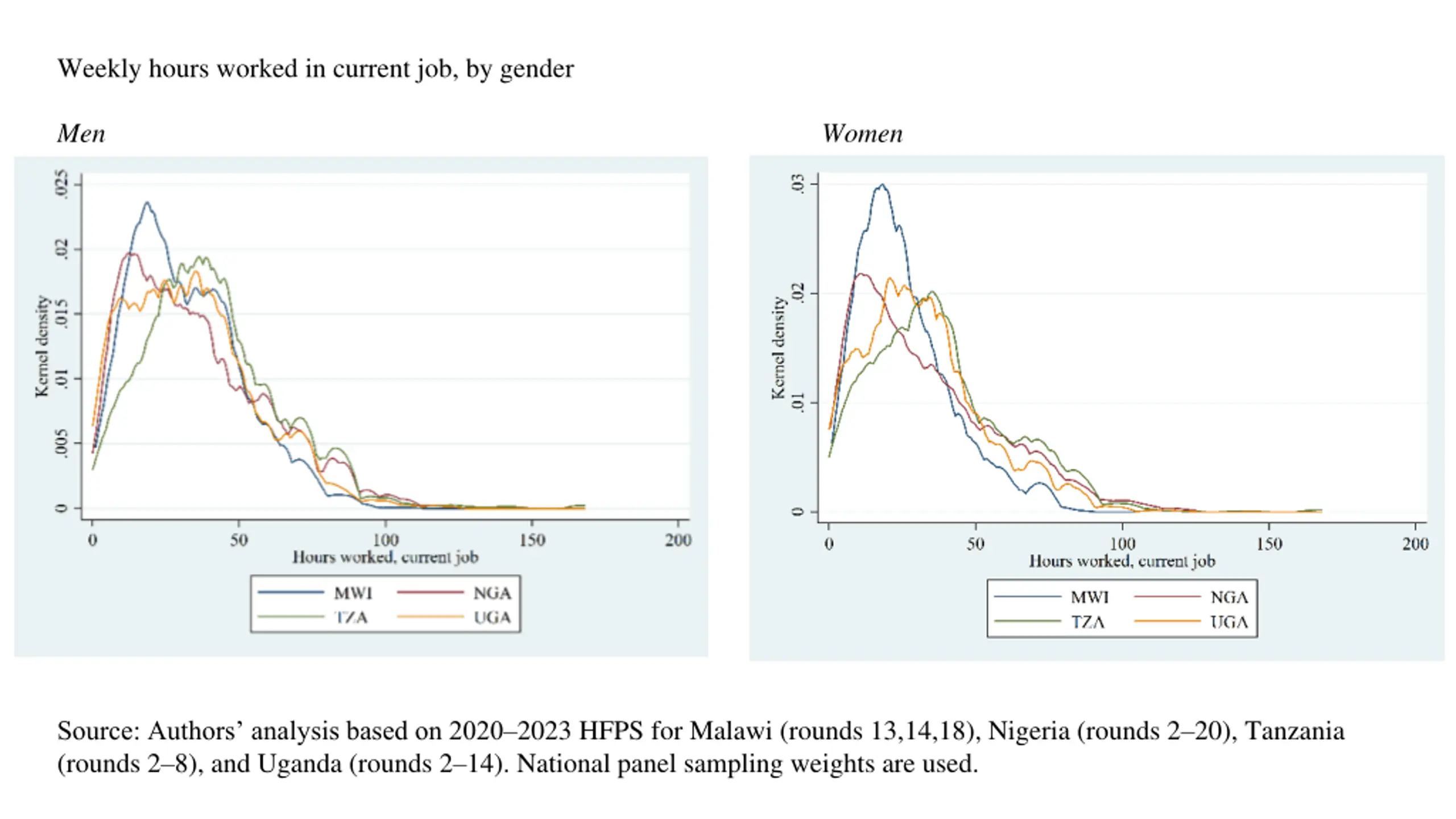 Weekly hours worked in current job, by gender Men Women Source: Authors analysis based on 2020 2023 HFPS for Malawi (rounds 13,14,18), Nigeria (rounds 2 20), Tanzania (rounds 2 8), and Uganda (rounds 2 14). National panel sampling weights are used.