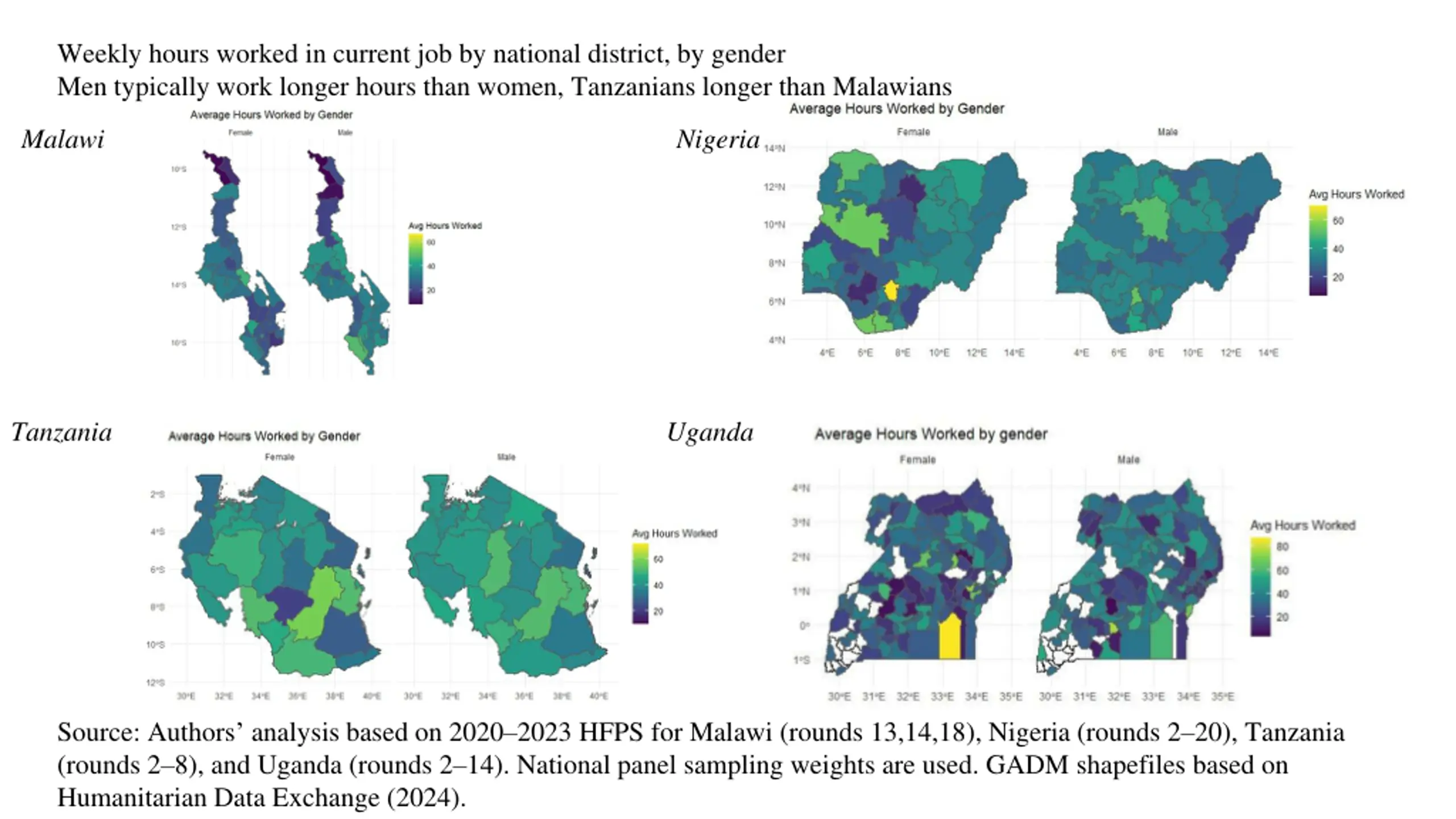 Weekly hours worked in current job by national district, by gender Men typically work longer hours than women, Tanzanians longer than Malawians Malawi Nigeria Tanzania Uganda Source: Authors analysis based on 2020 2023 HFPS for Malawi (rounds 13,14,18), Nigeria (rounds 2 20), Tanzania (rounds 2 8), and Uganda (rounds 2 14). National panel sampling weights are used. GADM shapefiles based on Humanitarian Data Exchange (2024).