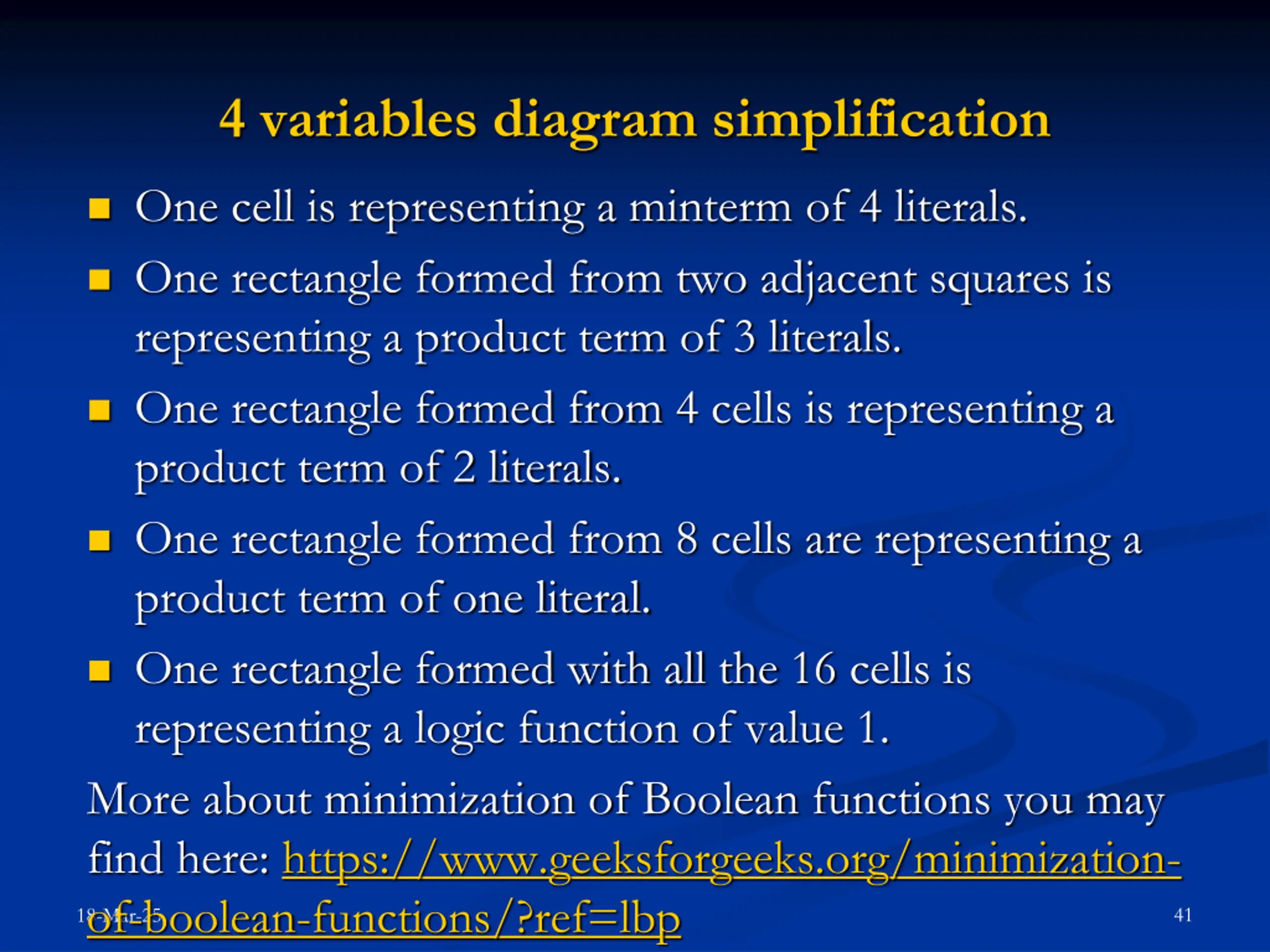 4 variables diagram simplification One cell is representing a minterm of 4 literals. One rectangle formed from two adjacent squares is representing a product term of 3 literals. One rectangle formed from 4 cells is representing a product term of 2 literals. One rectangle formed from 8 cells are representing a product term of one literal. One rectangle formed with all the 16 cells is representing a logic function of value 1. More about minimization of Boolean functions you may find here: https://www.geeksforgeeks.org/minimization- 18-Mar-25 of-boolean-functions/?ref=lbp 41