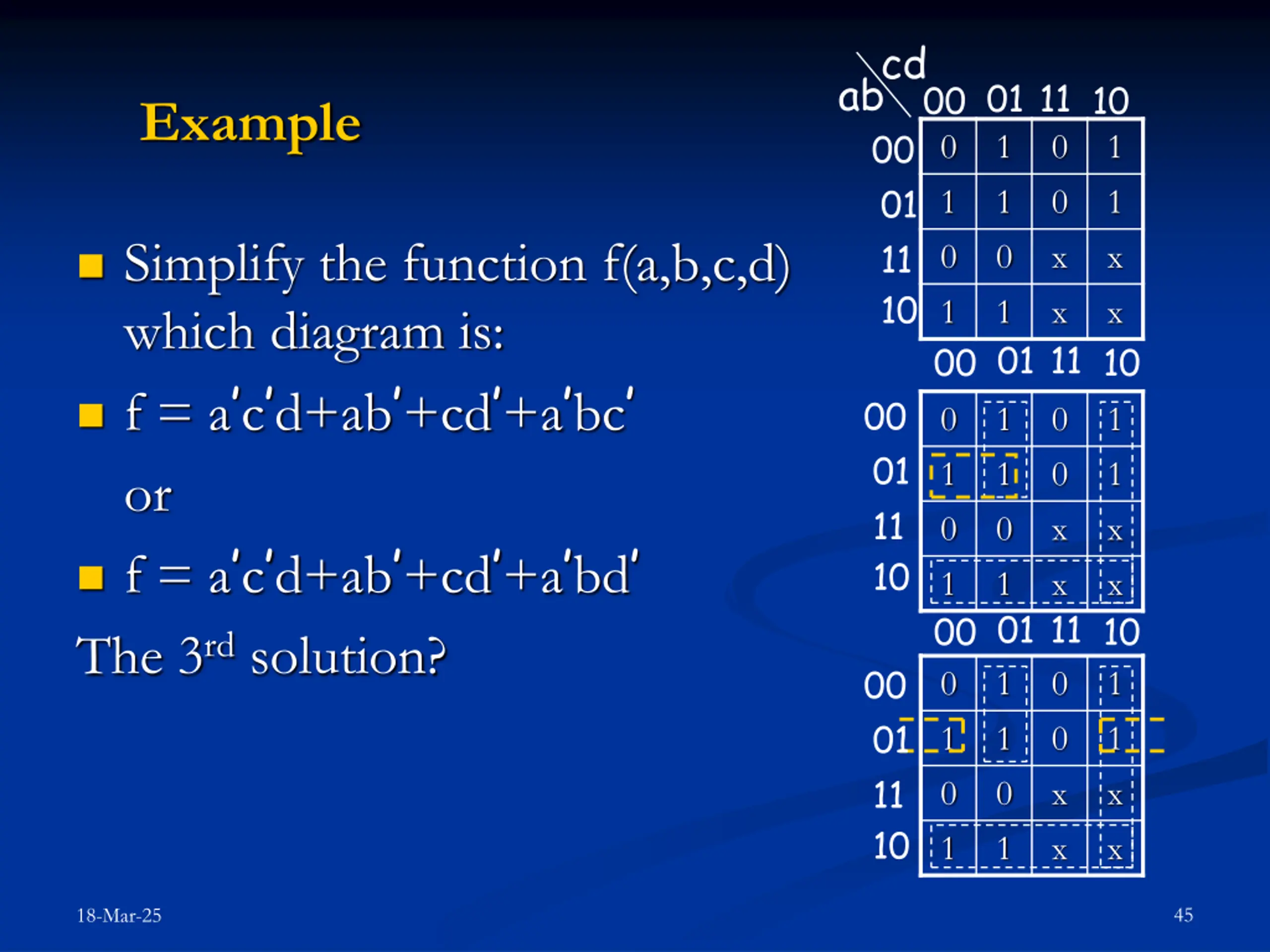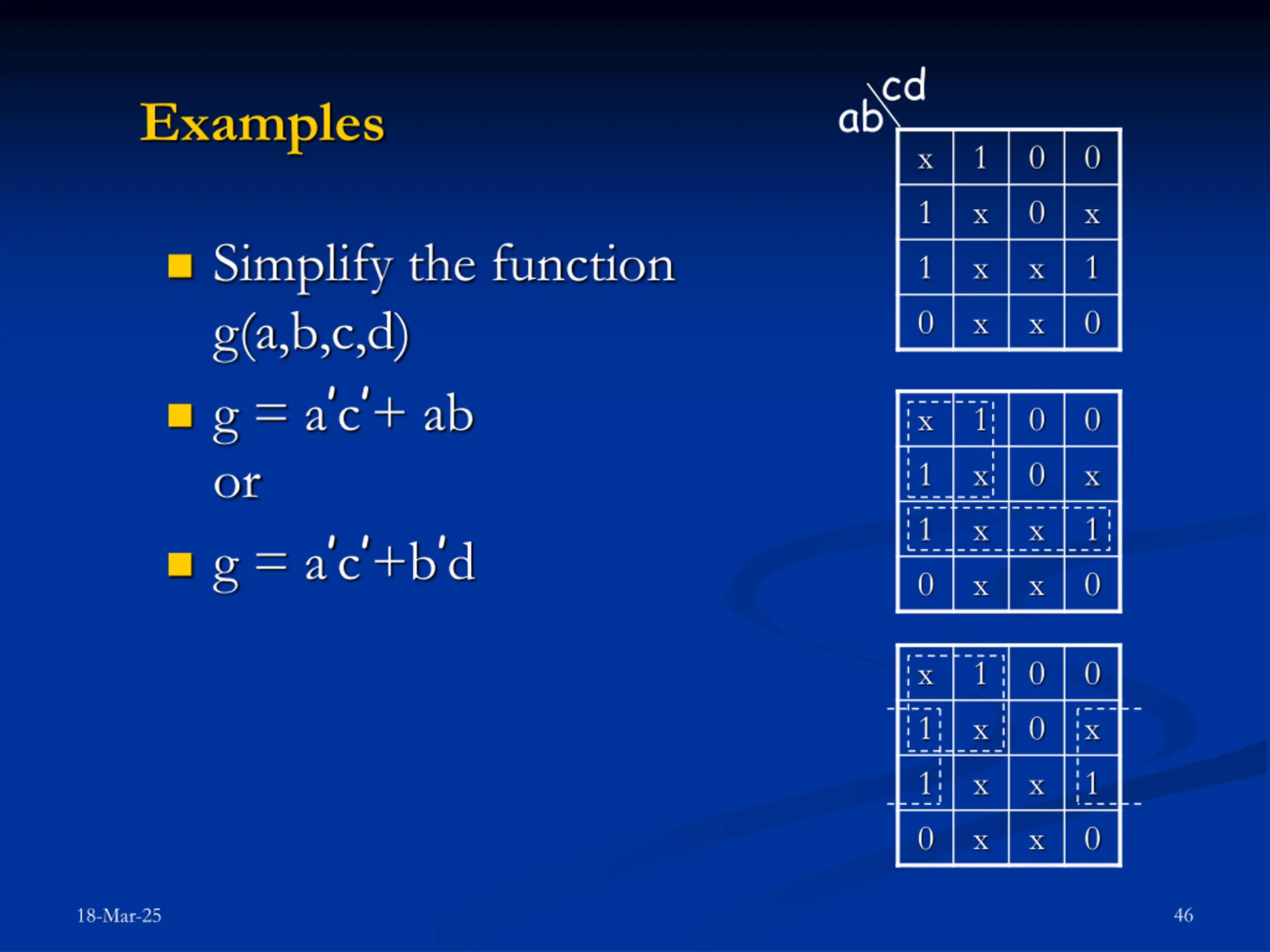 abcd Examples x 1 1 0 1 x x x 0 0 x x 0 x 1 0 Simplify the function g(a,b,c,d) g = a c + ab or g = a c +b d x 1 1 0 1 x x x 0 0 x x 0 x 1 0 x 1 1 0 1 x x x 0 0 x x 0 x 1 0 46 18-Mar-25