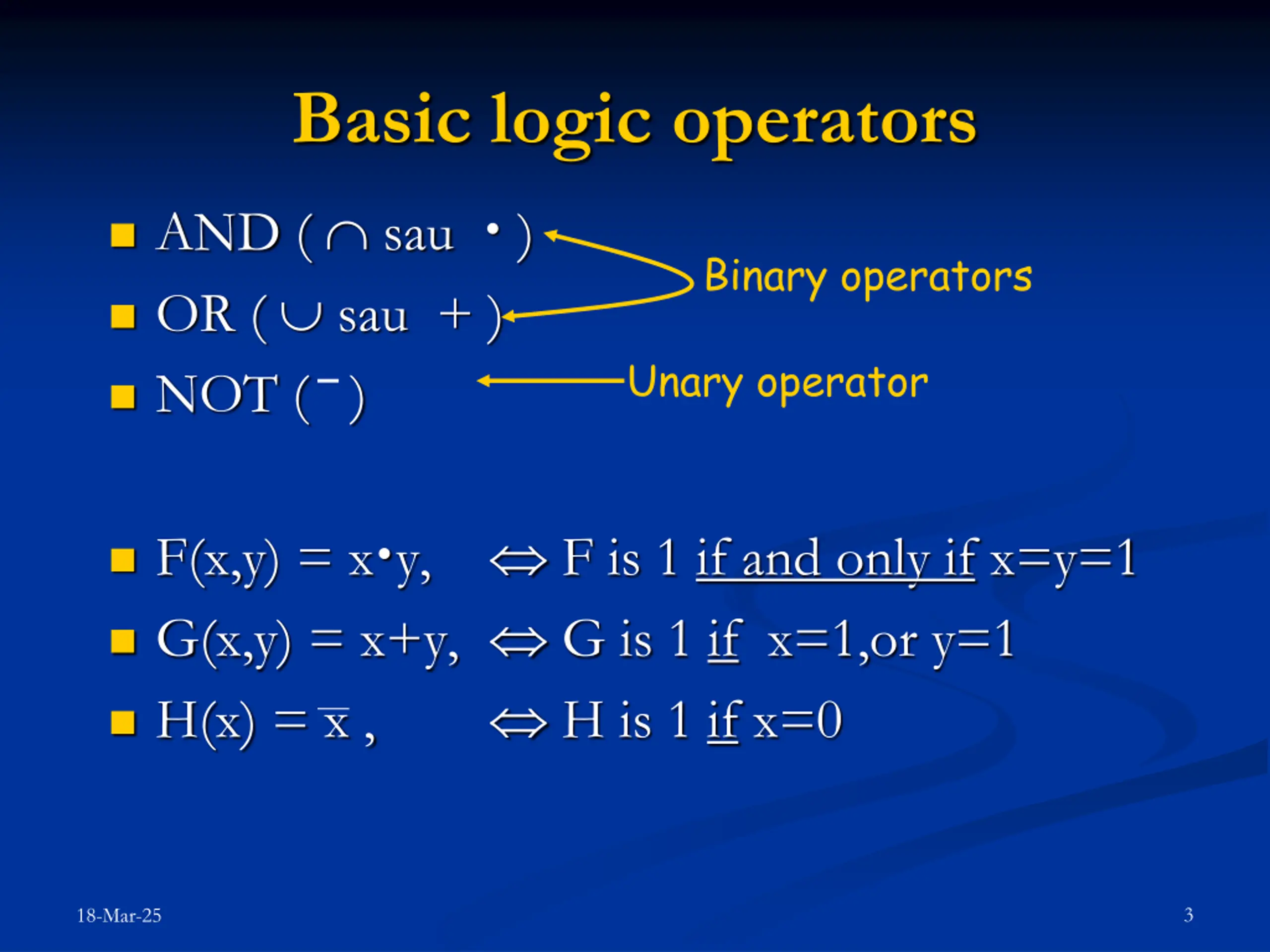 Basic logic operators AND ( sau ) OR ( sau + ) NOT ( ) Binary operators Unary operator F(x,y) = x y, F is 1 if and only if x=y=1 G(x,y) = x+y, G is 1 if x=1,or y=1 H(x) = x , H is 1 if x=0 3 18-Mar-25