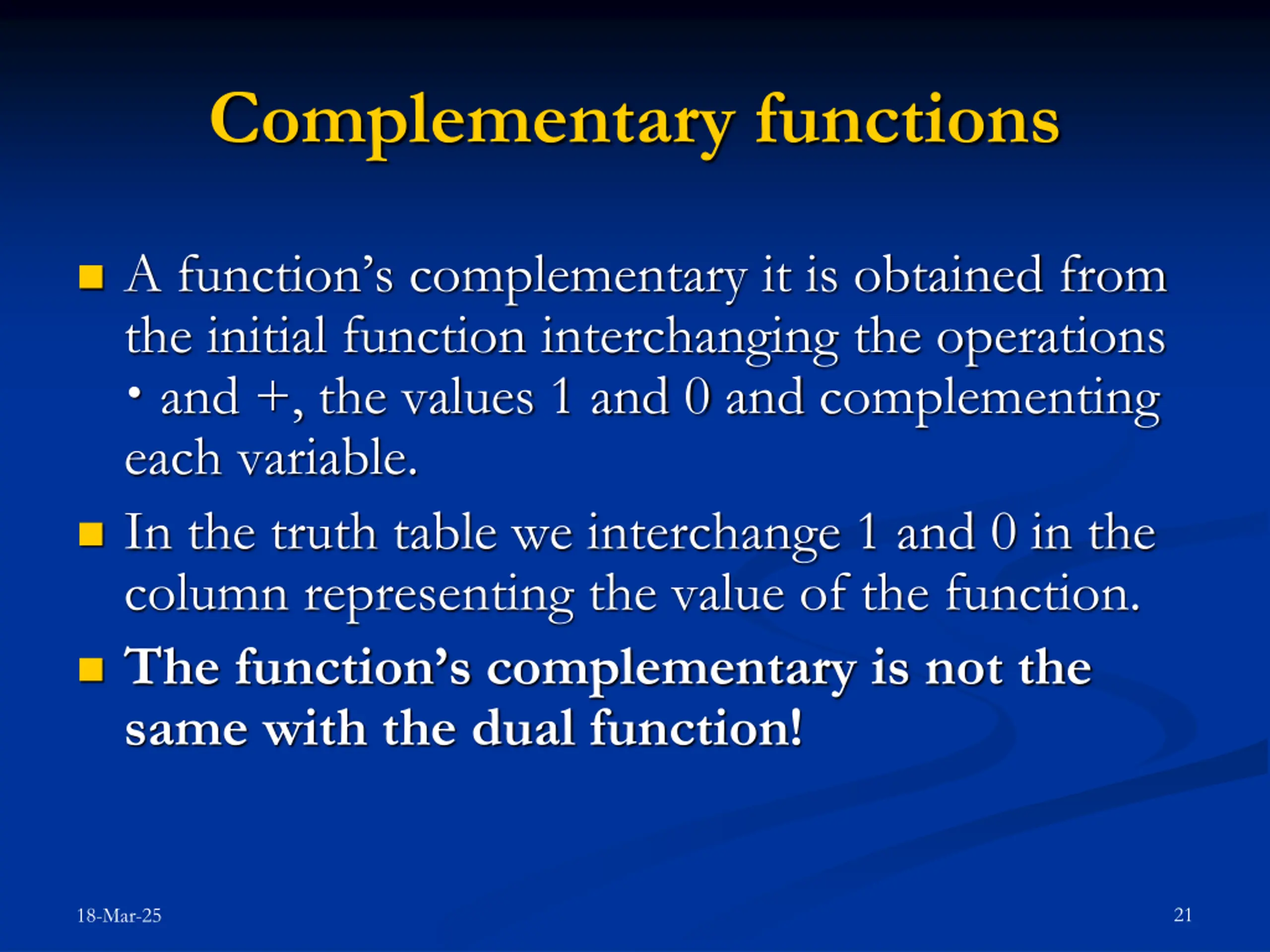 Complementary functions A function s complementary it is obtained from the initial function interchanging the operations and +, the values 1 and 0 and complementing each variable. In the truth table we interchange 1 and 0 in the column representing the value of the function. The function s complementary is not the same with the dual function! 21 18-Mar-25