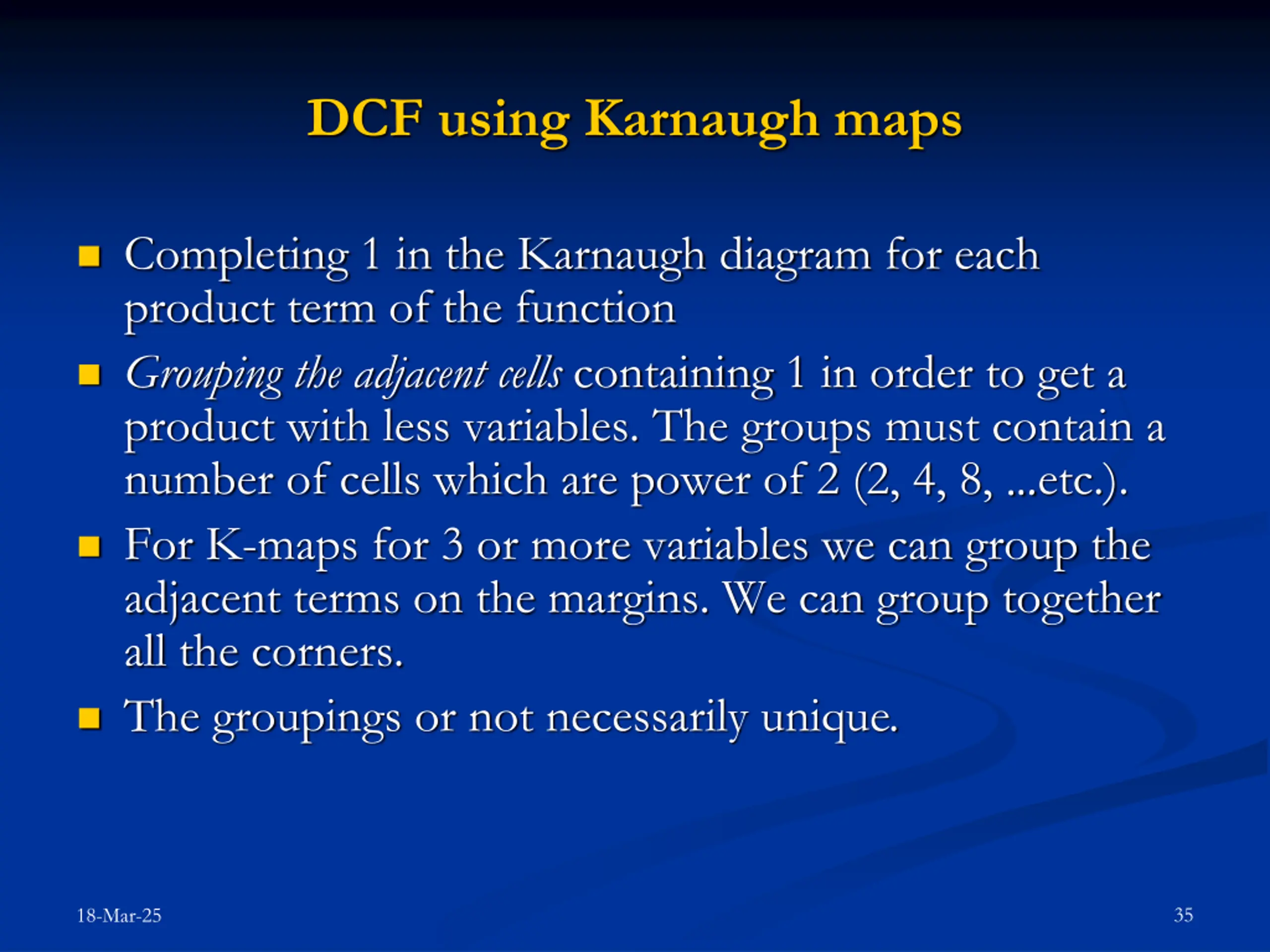 DCF using Karnaugh maps Completing 1 in the Karnaugh diagram for each product term of the function Grouping the adjacent cells containing 1 in order to get a product with less variables. The groups must contain a number of cells which are power of 2 (2, 4, 8, etc.). For K-maps for 3 or more variables we can group the adjacent terms on the margins. We can group together all the corners. The groupings or not necessarily unique. 35 18-Mar-25