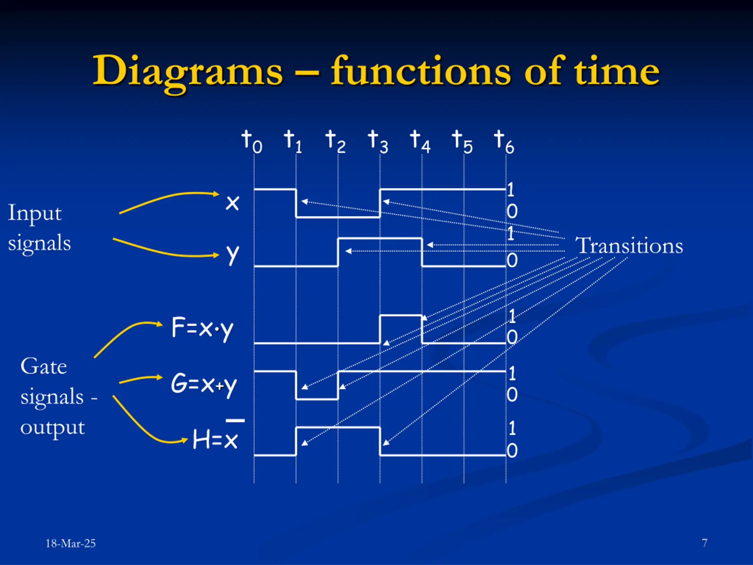 Diagrams functions of time t0 t1 t2 t3 t4 t5 t6 1 0 x Input signals 1 0 Transitions y 1 0 F=x y Gate signals - output 1 0 G=x+y 1 0 H=x 7 18-Mar-25