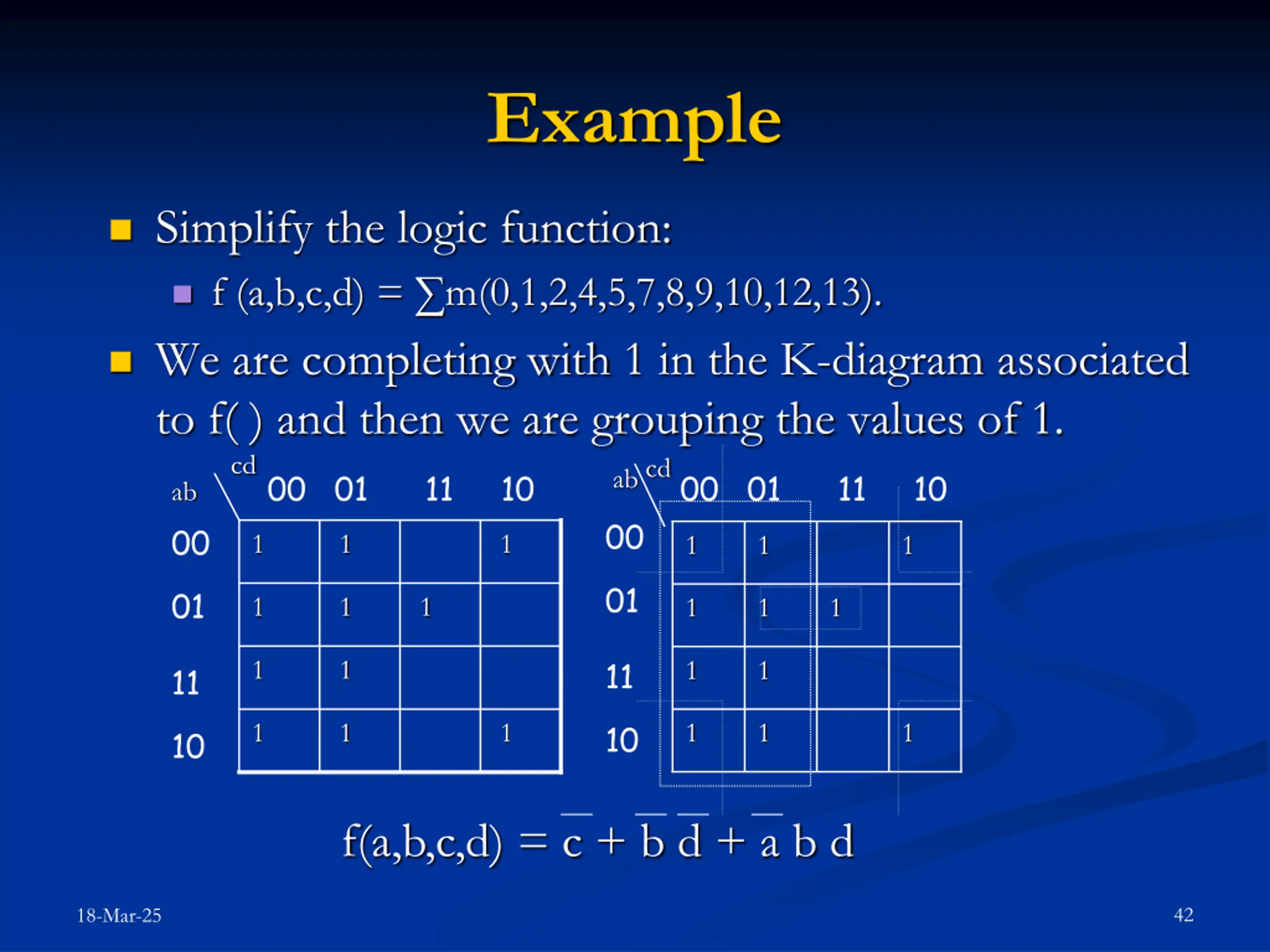Example Simplify the logic function: f (a,b,c,d) = m(0,1,2,4,5,7,8,9,10,12,13). We are completing with 1 in the K-diagram associated to f( ) and then we are grouping the values of 1. cd ab 00 01 11 10 00 01 11 abcd 00 01 11 10 00 1 1 1 1 1 1 01 11 1 1 1 1 1 1 1 1 1 1 10 1 1 1 1 1 1 10 f(a,b,c,d) = c + b d + a b d 42 18-Mar-25