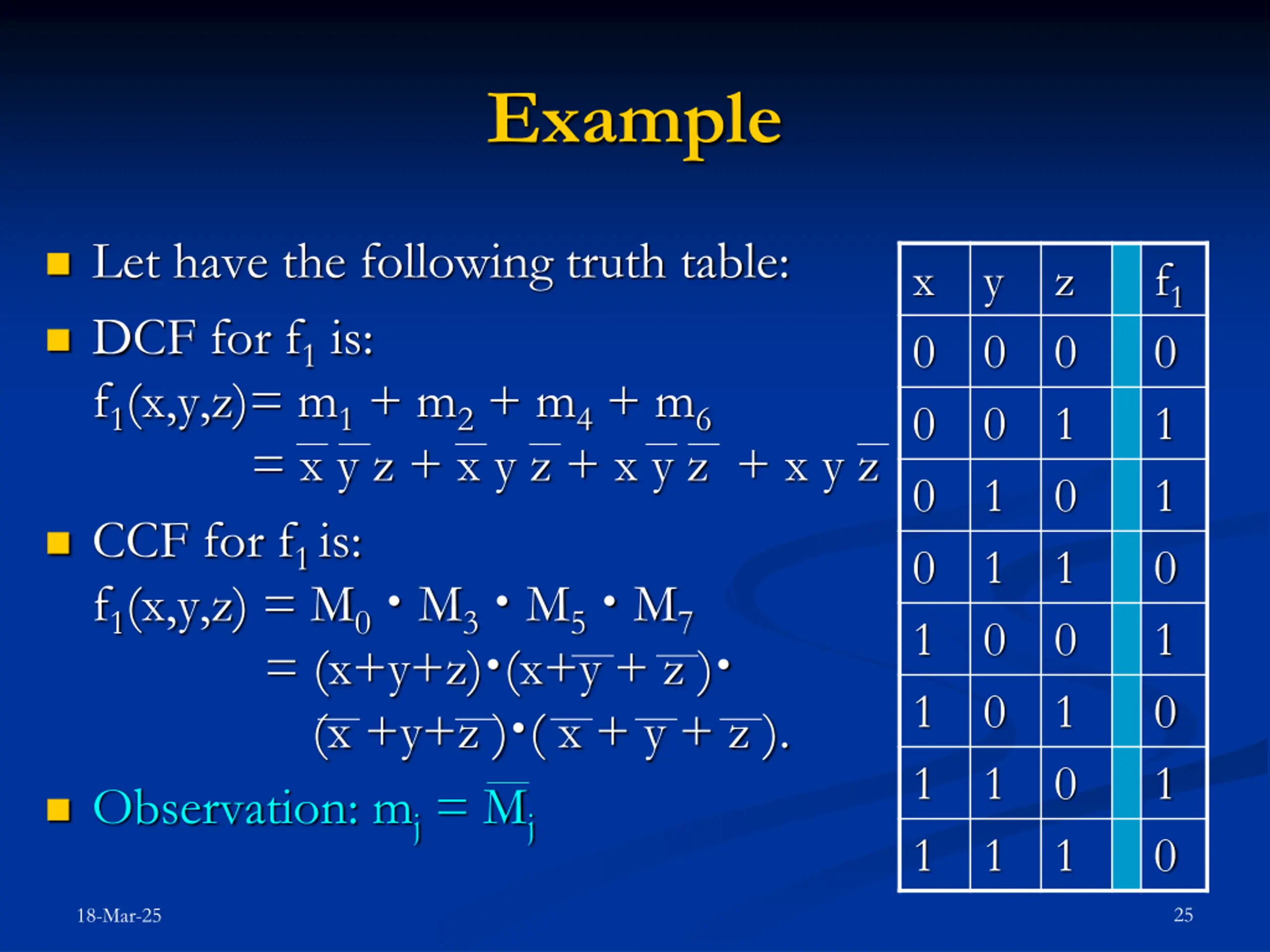 Example Let have the following truth table: DCF for f1 is: f1(x,y,z)= m1 + m2 + m4 + m6 = x y z + x y z + x y z + x y z CCF for f1 is: f1(x,y,z) = M0 M3 M5 M7 = (x+y+z) (x+y + z ) (x +y+z ) ( x + y + z ). Observation: mj = Mj x 0 0 0 0 1 1 1 1 y 0 0 1 1 0 0 1 1 z 0 1 0 1 0 1 0 1 f1 0 1 1 0 1 0 1 0 25 18-Mar-25