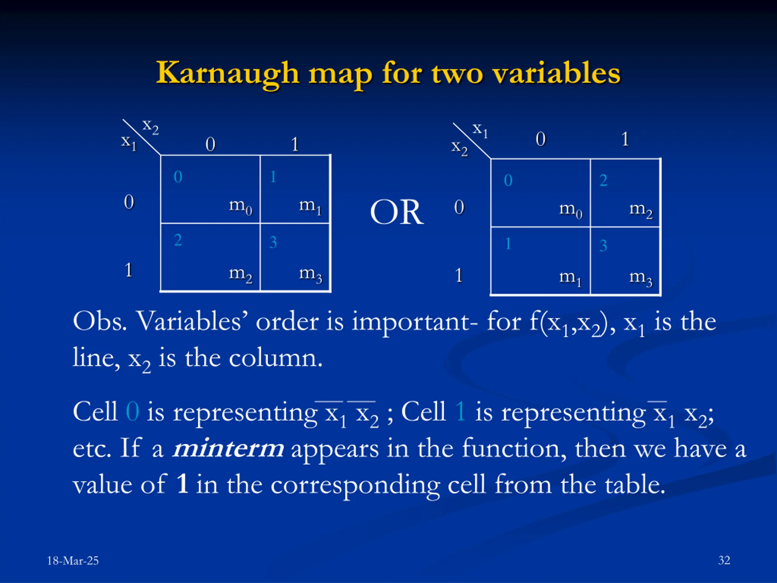 Karnaugh maps These maps are graphical representations of the boolean functions. One cell of the diagram is corresponding to a line in the truth table. Also, a cell of the diagram is corresponding to a minterm or maxterm of the boolean expression Zones with multiple adjacent cells are corresponding to standard terms 31 18-Mar-25