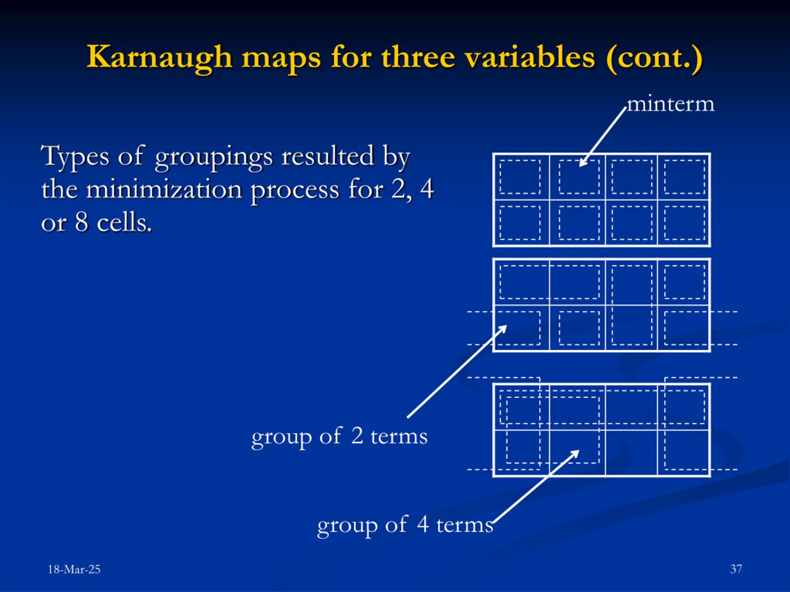 Karnaugh maps for three variables (cont.) minterm Types of groupings resulted by the minimization process for 2, 4 or 8 cells. group of 2 terms group of 4 terms 37 18-Mar-25