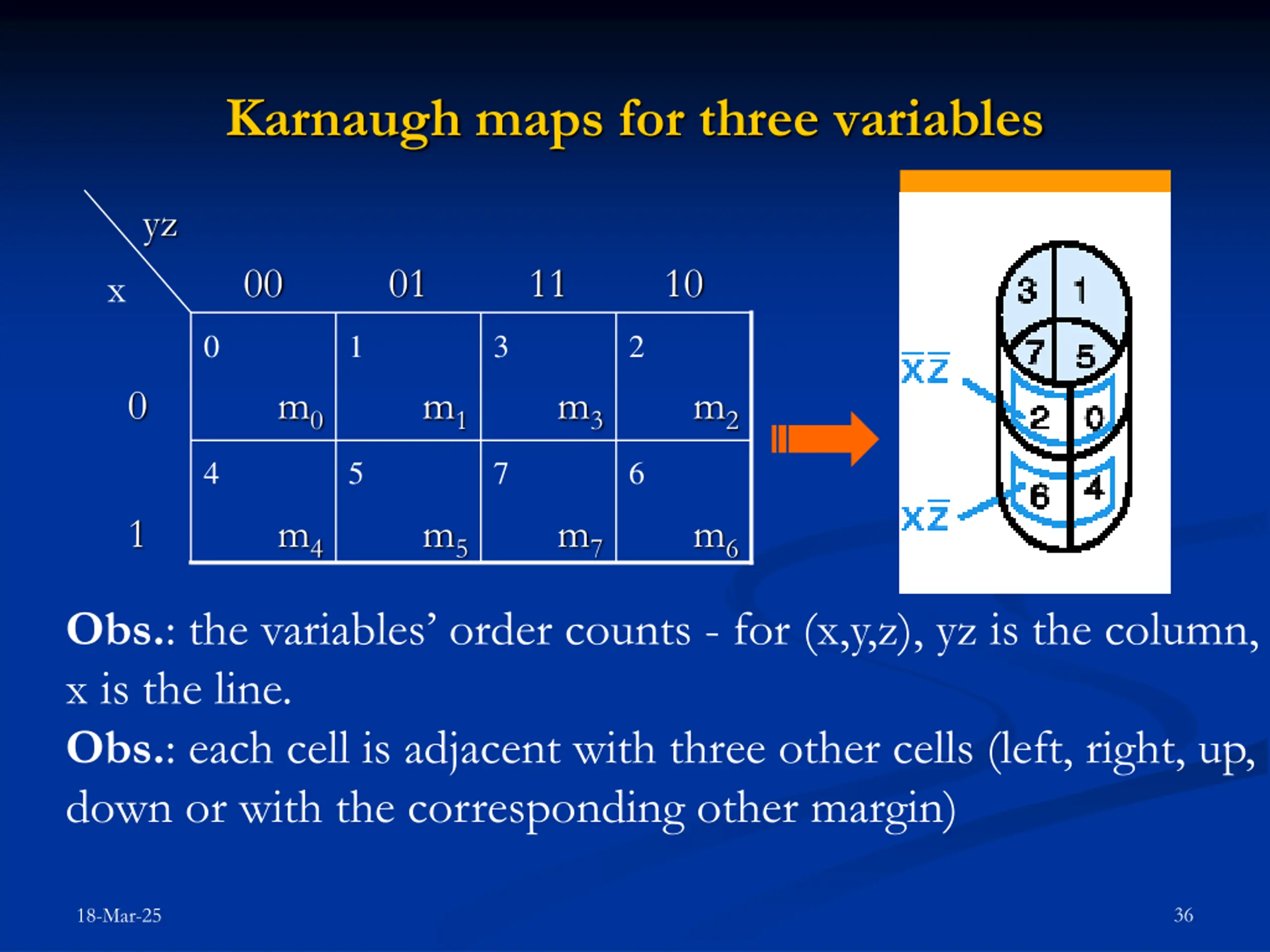 Karnaugh maps for three variables yz 00 01 11 10 x 0 1 3 2 0 m0 m1 m3 m2 4 5 7 6 1 m4 m5 m7 m6 Obs.: the variables order counts - for (x,y,z), yz is the column, x is the line. Obs.: each cell is adjacent with three other cells (left, right, up, down or with the corresponding other margin) 36 18-Mar-25