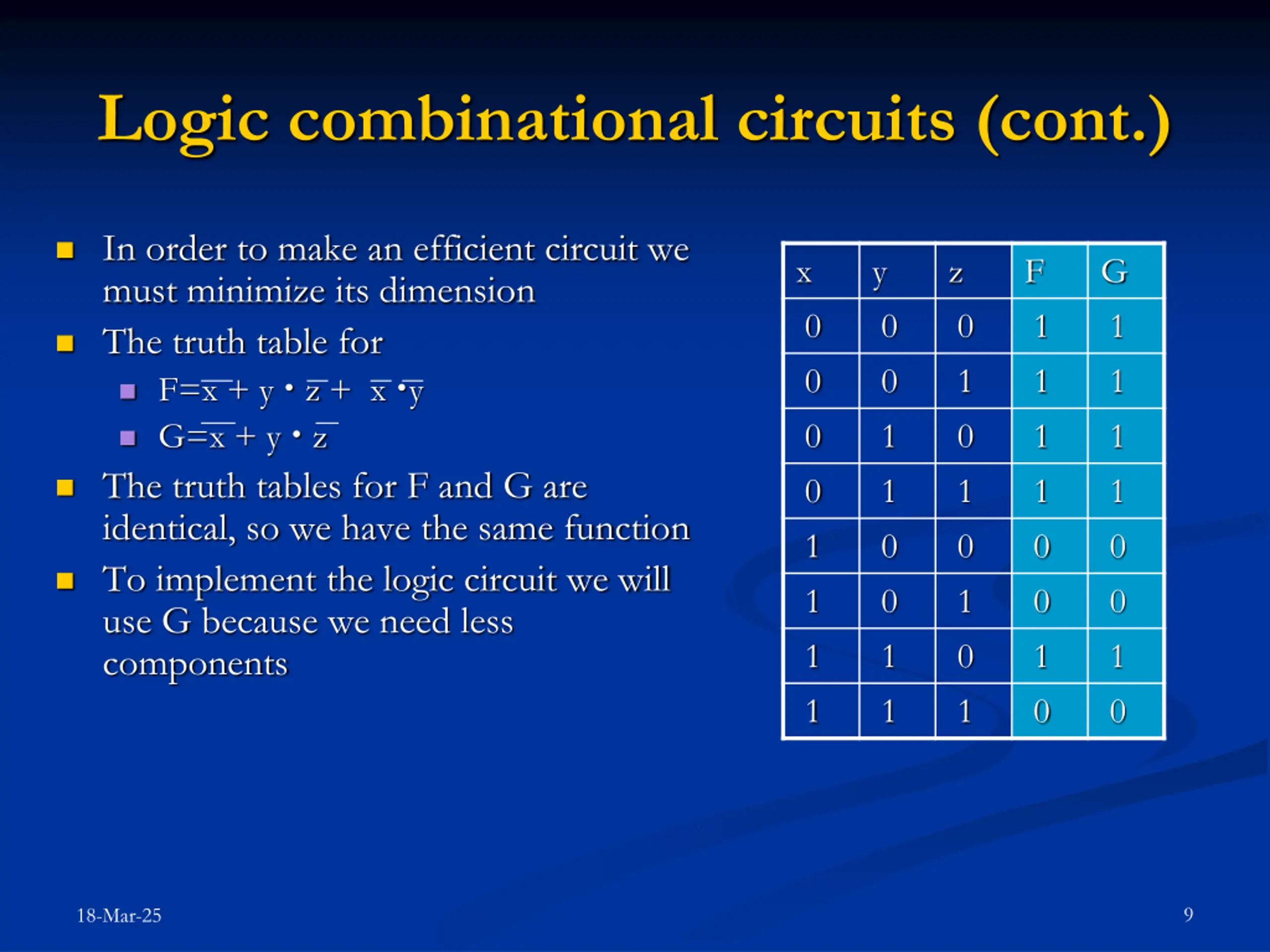 Logic combinational circuits (cont.) In order to make an efficient circuit we must minimize its dimension The truth table for F=x + y z + x y G=x + y z The truth tables for F and G are identical, so we have the same function To implement the logic circuit we will use G because we need less components x y z F 1 1 1 1 0 0 1 0 G 1 1 1 1 0 0 1 0 0 0 0 0 1 1 1 1 0 0 1 1 0 0 1 1 0 1 0 1 0 1 0 1 9 18-Mar-25