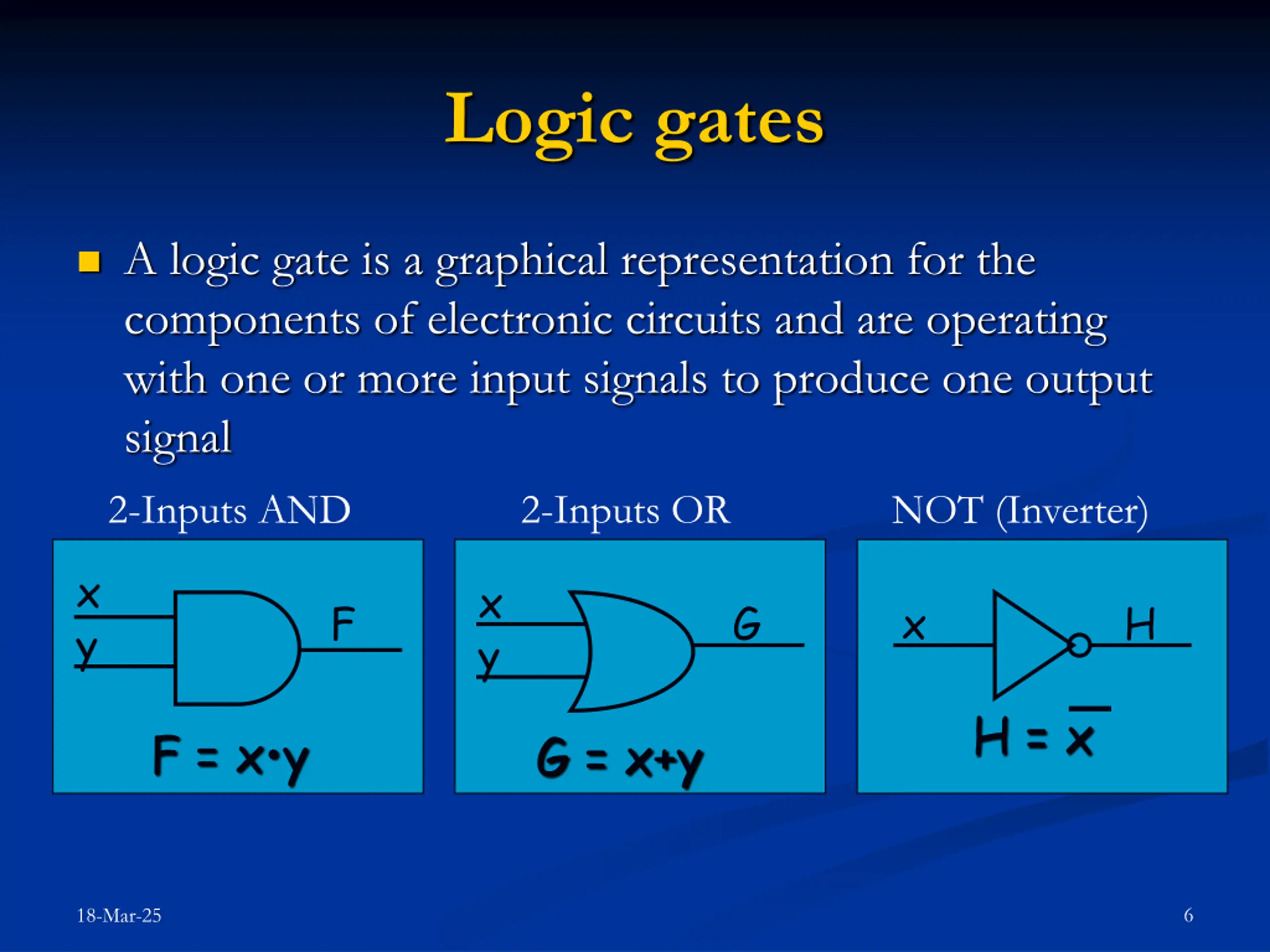 Logic gates A logic gate is a graphical representation for the components of electronic circuits and are operating with one or more input signals to produce one output signal 2-Inputs AND 2-Inputs OR NOT (Inverter) x y x y F G x H H = x F = x y G = x+y 6 18-Mar-25