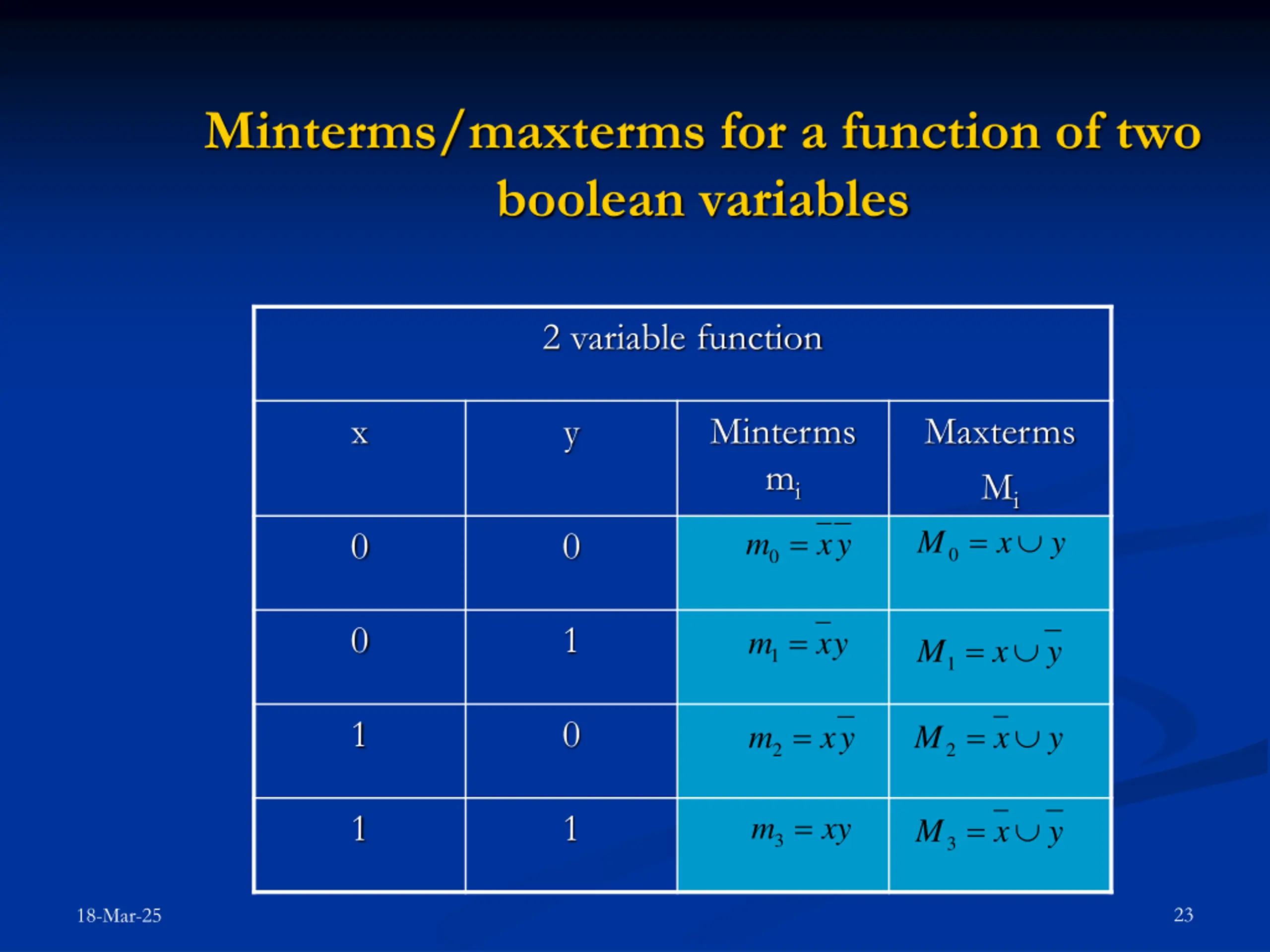 Minterms/maxterms for a function of two boolean variables 2 variable function x y Minterms mi m = 0 Maxterms Mi x M = 0 y x y 0 0 0 1 m = 1 x y = M x y 1 1 0 = m = 2 M x y x y 2 m = 3 1 1 = xy M x y 3 23 18-Mar-25