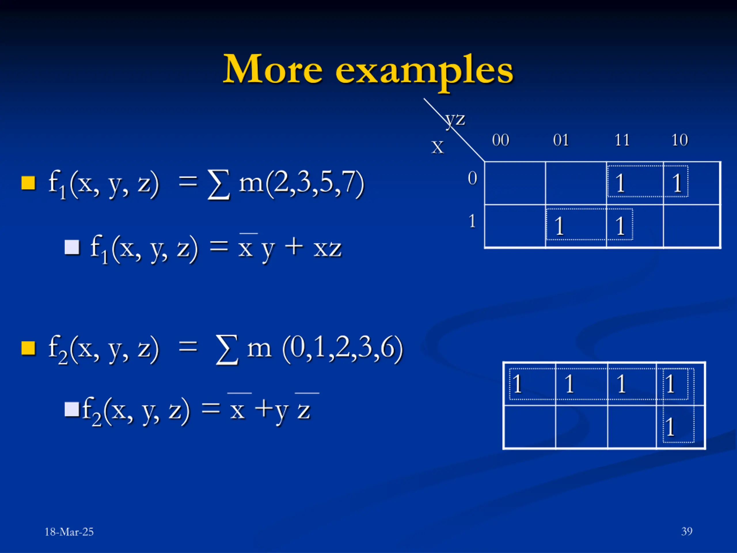 More examples yz 00 01 11 10 X f1(x, y, z) = m(2,3,5,7) 0 1 1 1 1 1 f1(x, y, z) = x y + xz f2(x, y, z) = m (0,1,2,3,6) 1 1 1 1 1 f2(x, y, z) = x +y z 39 18-Mar-25
