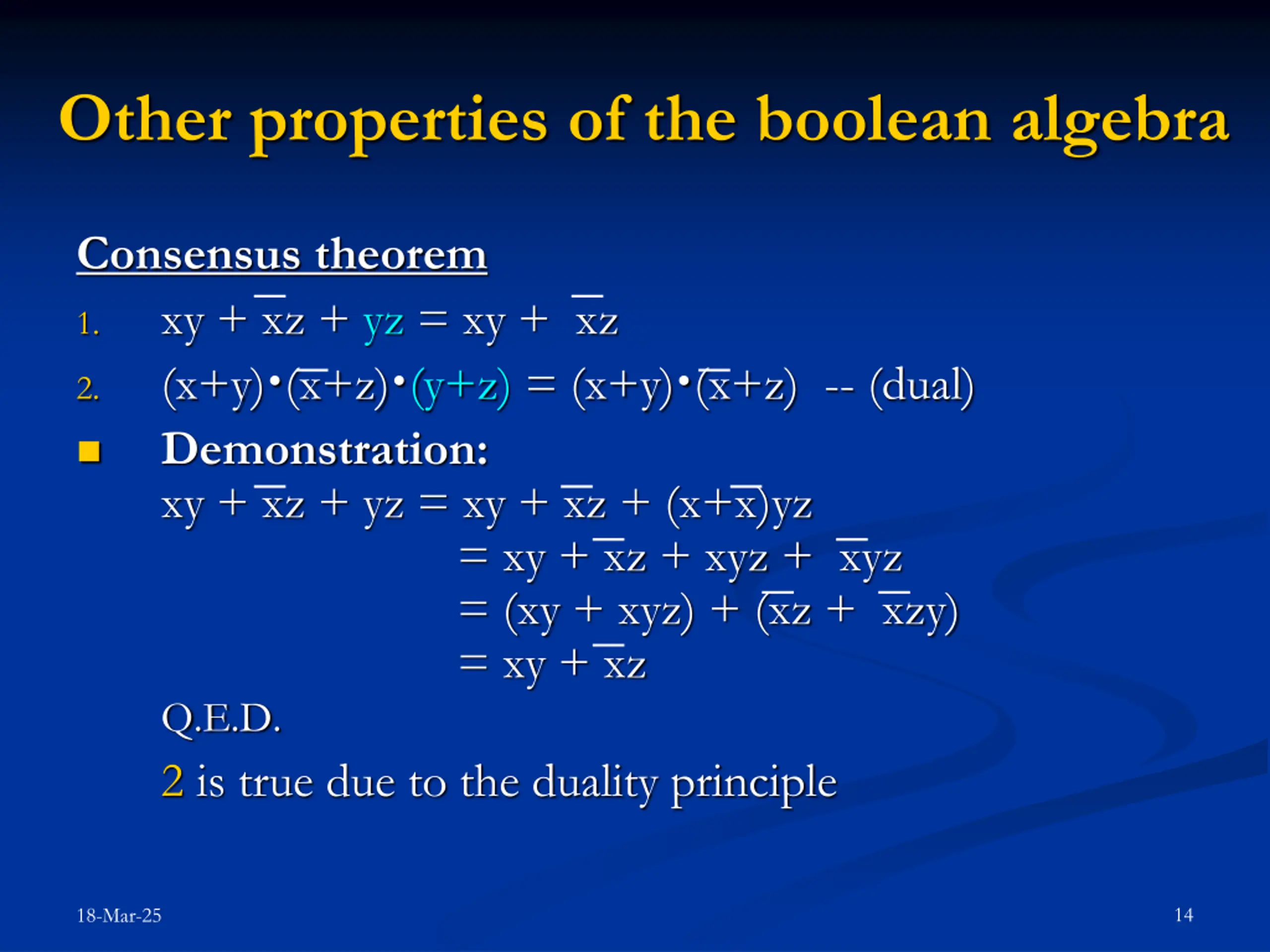 Other properties of the boolean algebra Consensus theorem xy + xz + yz = xy + xz (x+y) (x+z) (y+z) = (x+y) (x+z) -- (dual) Demonstration: xy + xz + yz = xy + xz + (x+x)yz = xy + xz + xyz + xyz = (xy + xyz) + (xz + xzy) = xy + xz Q.E.D. 2 is true due to the duality principle 1. 2. 14 18-Mar-25