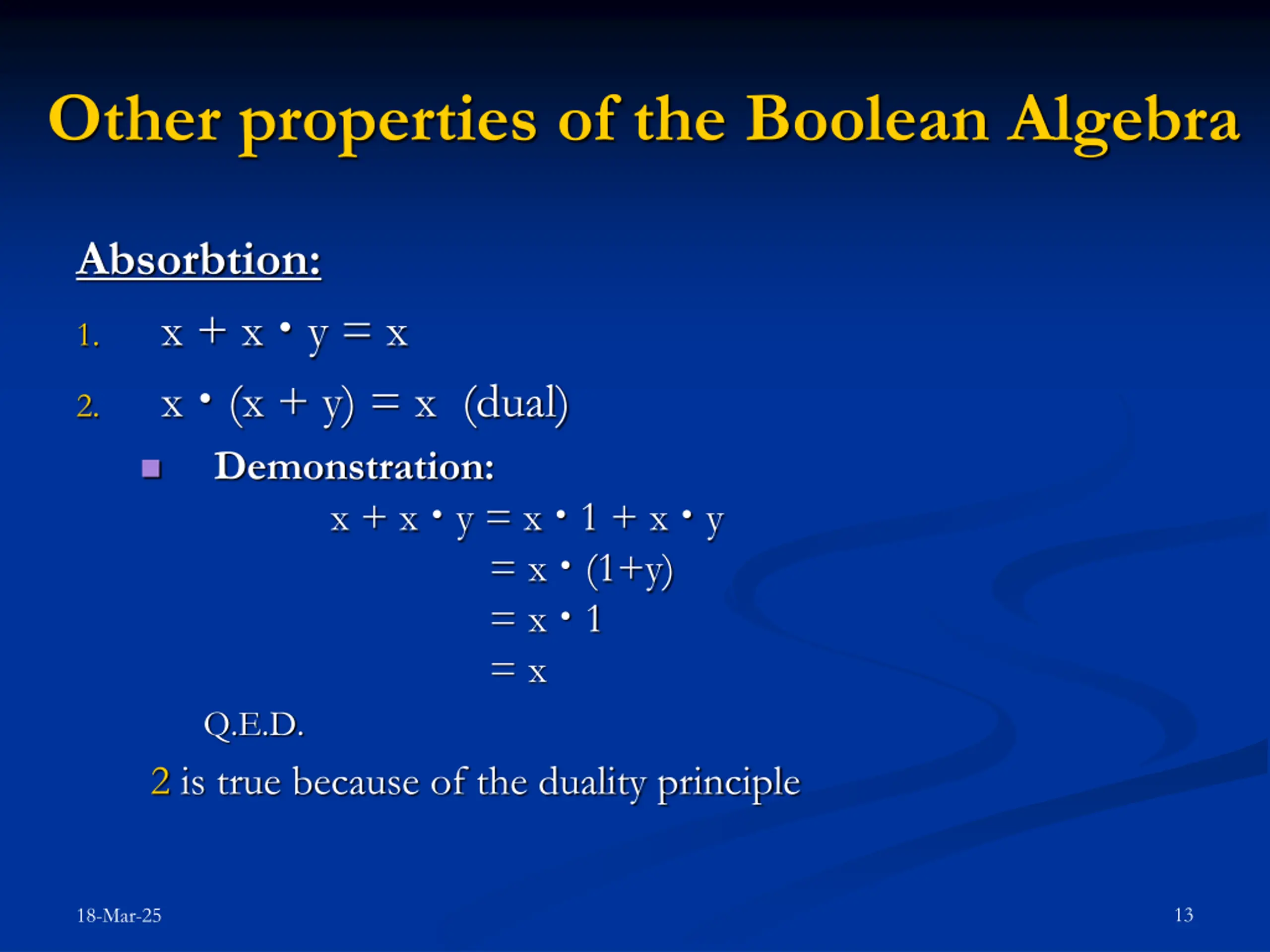 Other properties of the Boolean Algebra Absorbtion: x + x y = x x (x + y) = x (dual) Demonstration: 1. 2. x + x y = x 1 + x y = x (1+y) = x 1 = x Q.E.D. 2 is true because of the duality principle 13 18-Mar-25