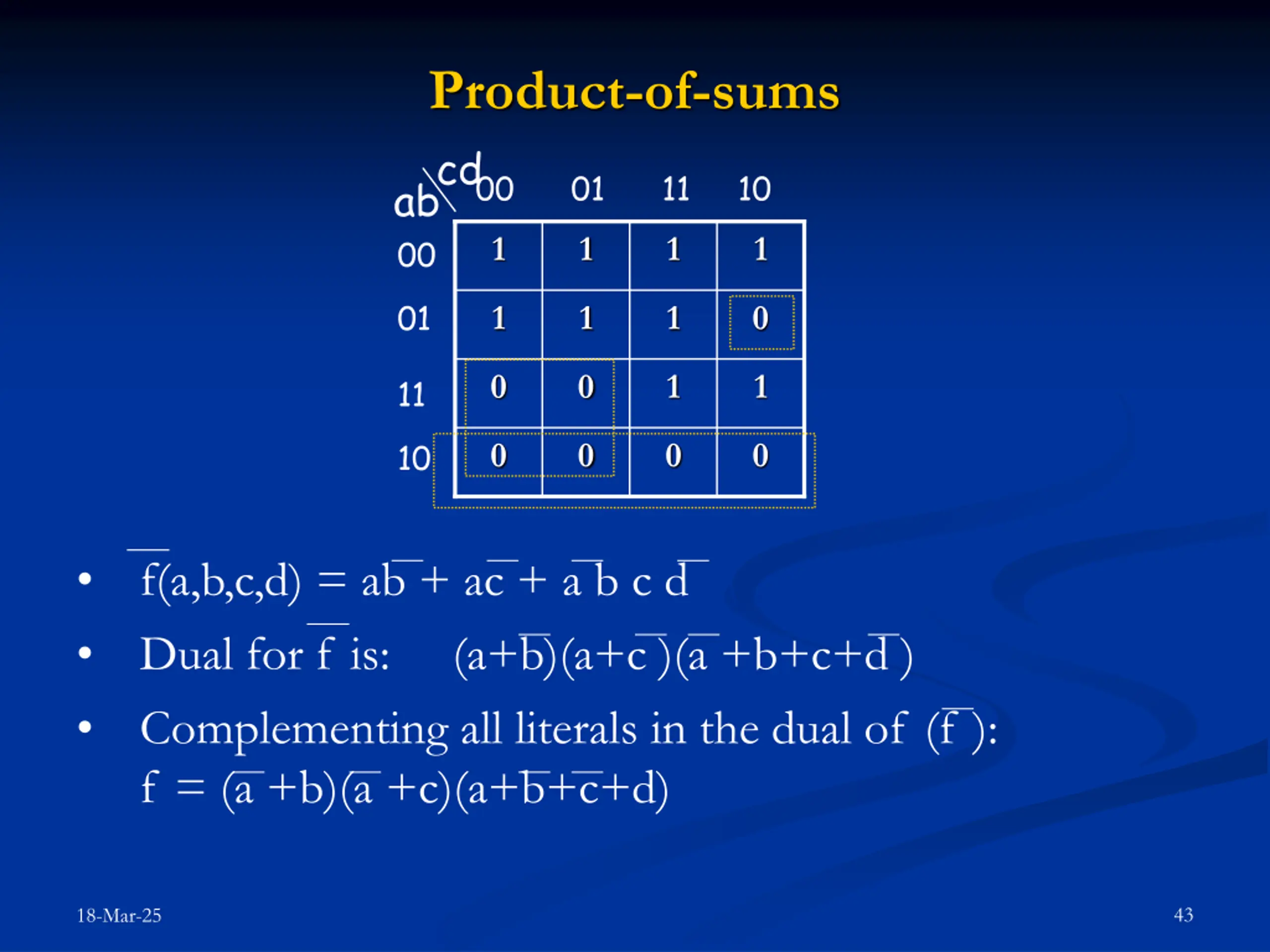 Product-of-sums abcd 00 00 01 11 10 1 1 1 1 01 11 1 1 1 0 0 0 1 1 10 0 0 0 0 f(a,b,c,d) = ab + ac + a b c d Dual for f is: (a+b)(a+c )(a +b+c+d ) Complementing all literals in the dual of (f ): f = (a +b)(a +c)(a+b+c+d) 43 18-Mar-25
