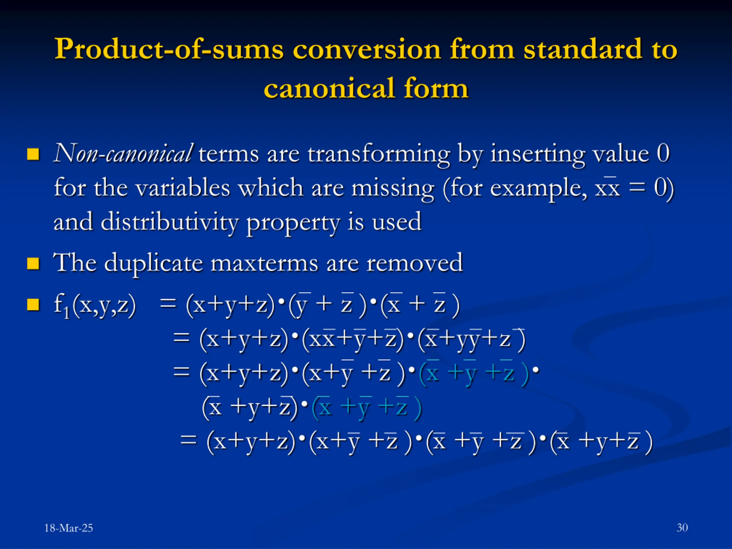 Product-of-sums conversion from standard to canonical form Non-canonical terms are transforming by inserting value 0 for the variables which are missing (for example, xx = 0) and distributivity property is used The duplicate maxterms are removed f1(x,y,z) = (x+y+z) (y + z ) (x + z ) = (x+y+z) (xx+y+z) (x+yy+z ) = (x+y+z) (x+y +z ) (x +y +z ) (x +y+z) (x +y +z ) = (x+y+z) (x+y +z ) (x +y +z ) (x +y+z ) 30 18-Mar-25