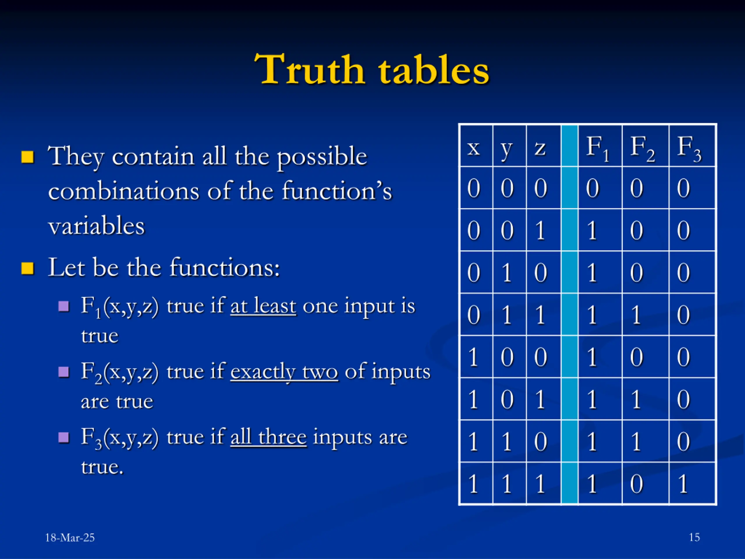 Truth tables x y z 0 0 0 0 0 1 0 1 0 0 1 1 1 0 0 1 0 1 1 1 0 1 1 1 F1F2F3 0 0 1 0 1 0 1 1 1 0 1 1 1 1 1 0 They contain all the possible combinations of the function s variables Let be the functions: F1(x,y,z) true if at least one input is true F2(x,y,z) true if exactly two of inputs are true F3(x,y,z) true if all three inputs are true. 0 0 0 0 0 0 0 1 15 18-Mar-25