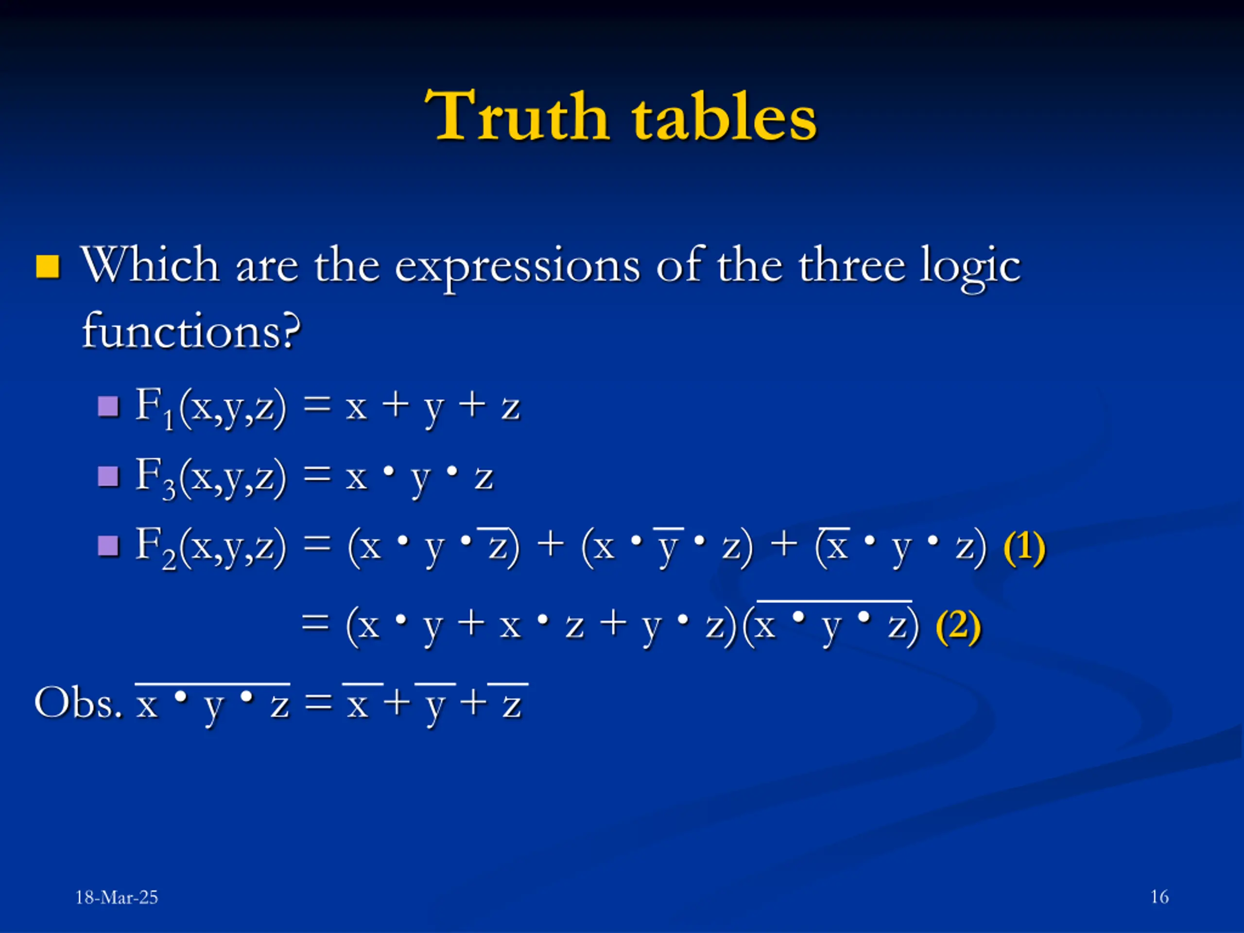 Truth tables Which are the expressions of the three logic functions? F1(x,y,z) = x + y + z F3(x,y,z) = x y z F2(x,y,z) = (x y z) + (x y z) + (x y z) (1) = (x y + x z + y z)(x y z) (2) Obs. x y z = x + y + z 16 18-Mar-25
