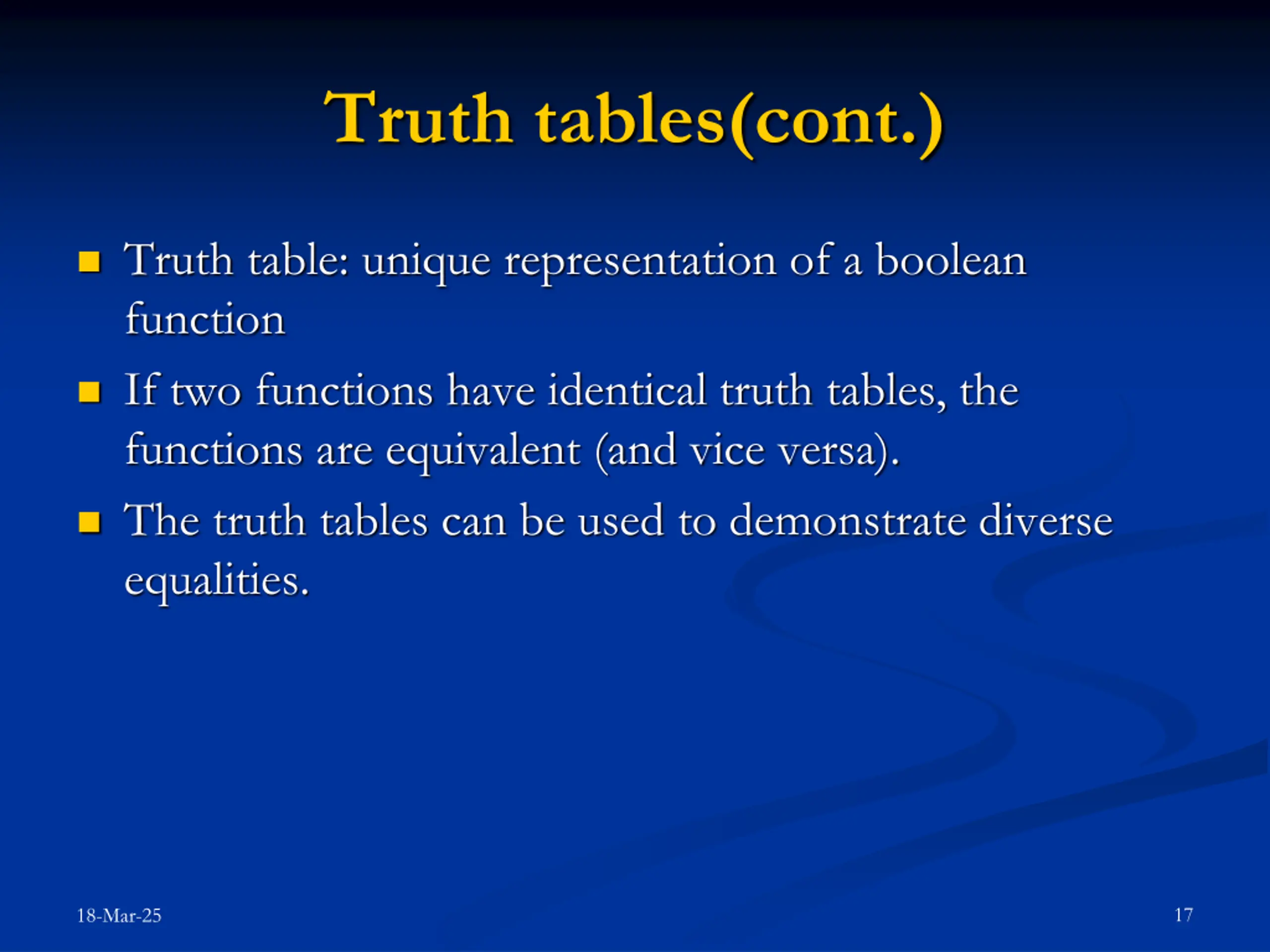 Truth tables(cont.) Truth table: unique representation of a boolean function If two functions have identical truth tables, the functions are equivalent (and vice versa). The truth tables can be used to demonstrate diverse equalities. 17 18-Mar-25